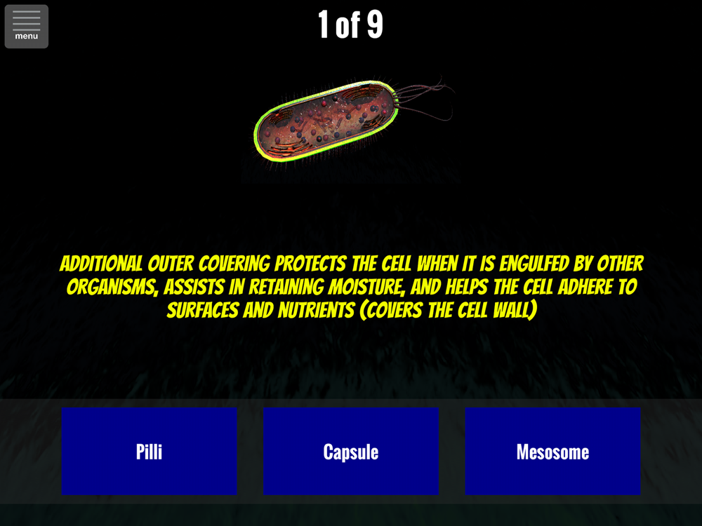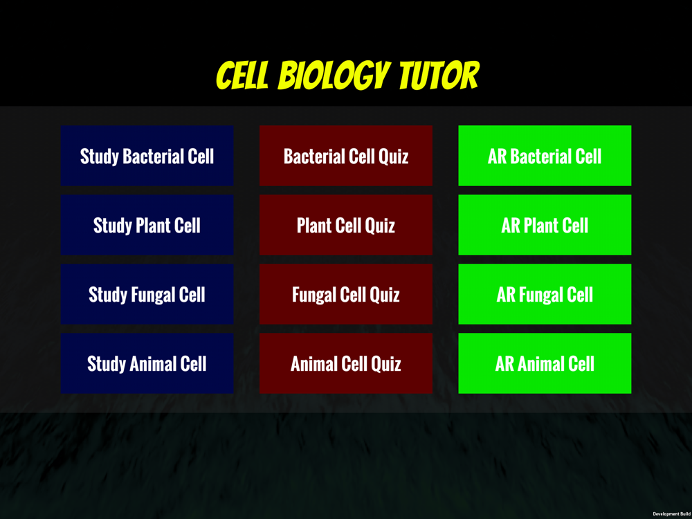 Cell biology tutor teaches students cell organelles for Animal, Plant, Fungi and Bacterial cells. The app contains a study section which highlights each organelle and provides a definition of the organelle function.