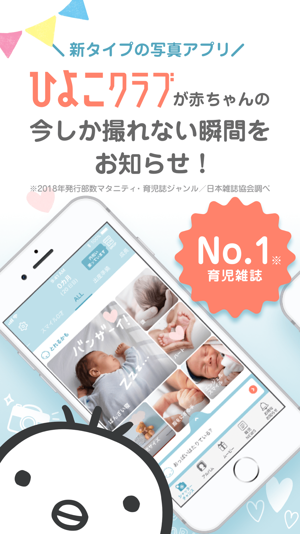 【ひよこクラブ】の公式アプリ「まいひよ(まいにちのひよこクラブ Babyアルバム)」は、赤ちゃんの成長に合わせて撮っておきたいシャッターチャンスのお題をお知らせする成長記録アプリです。
