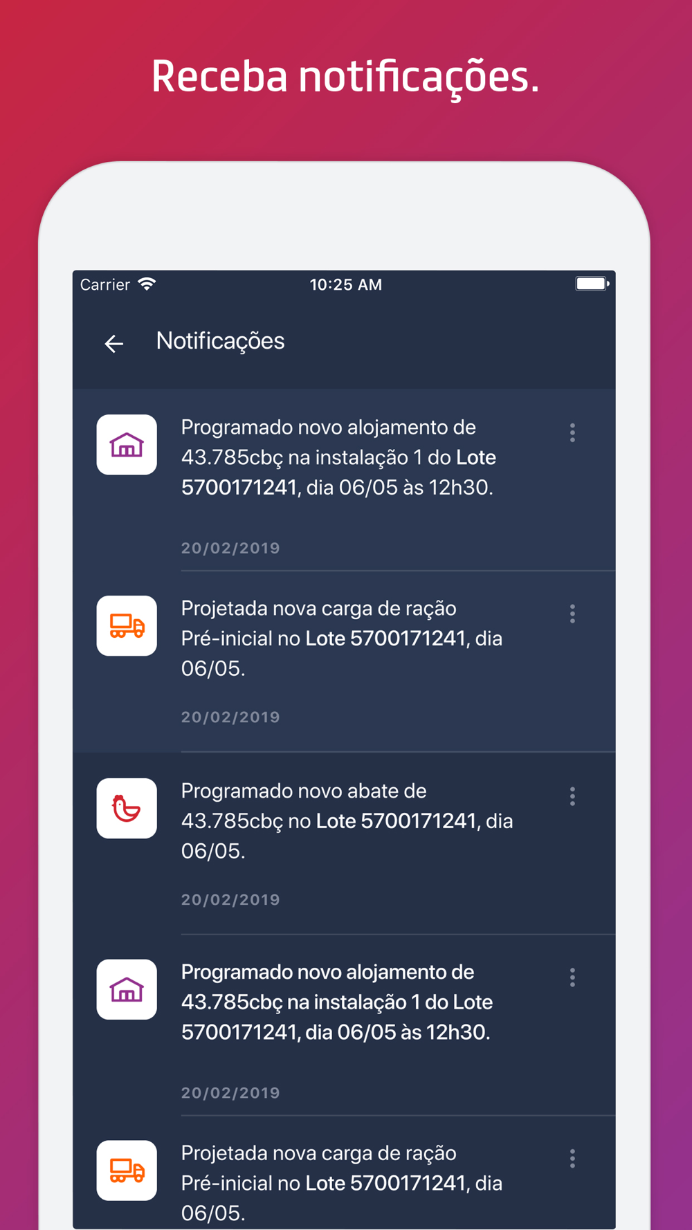A sincronização dos dados obtidos através de notificações de entrega de ração, alojamento e abate permite a tomada de decisão em menor tempo, facilitando o controle da produção.