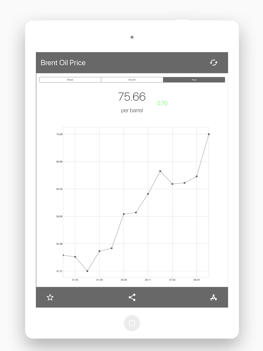 The simple and pretty application shows the current Brent oil price. Charts with price for week, month and year. Update every 15 min.