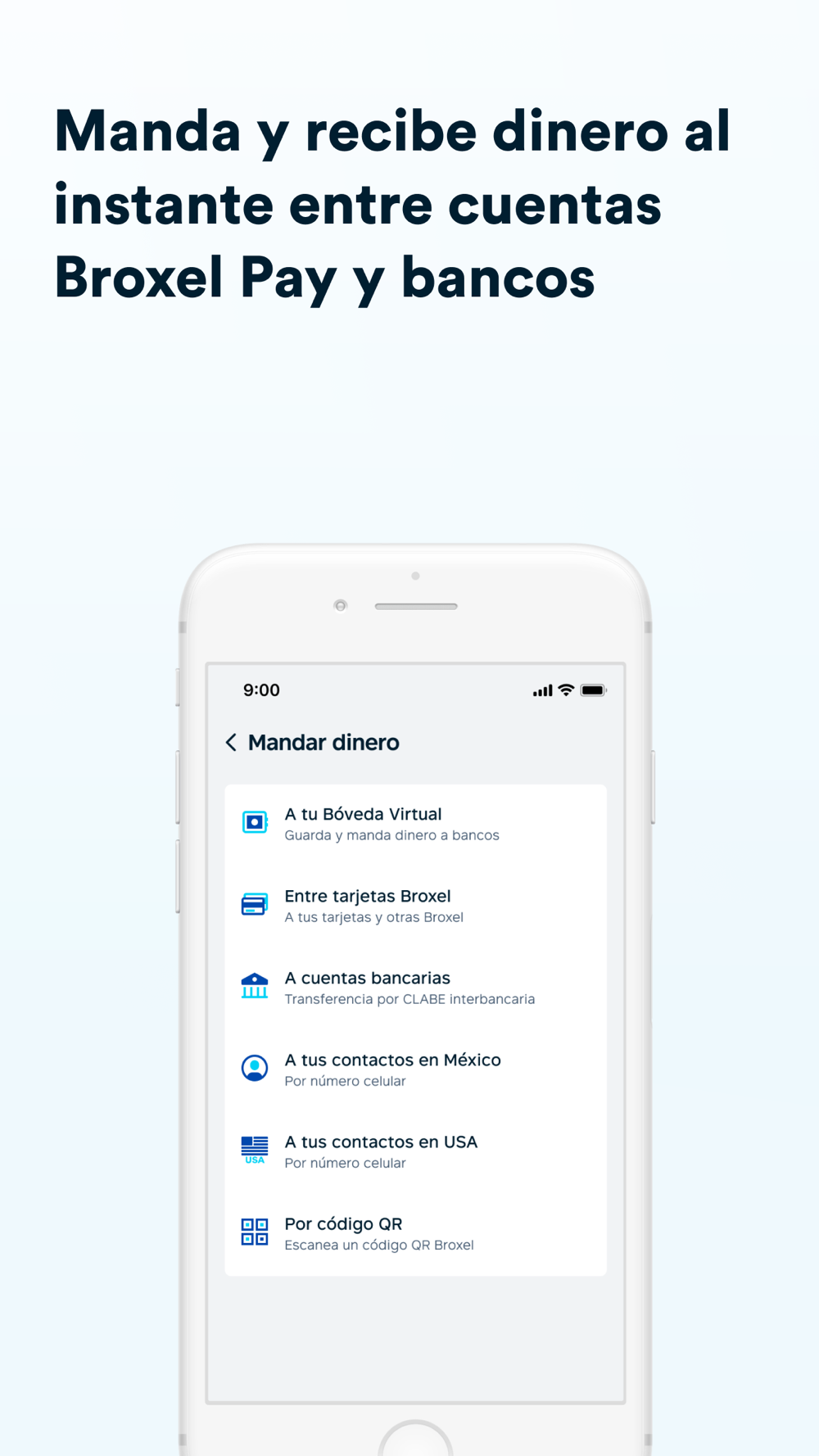 Manda dinero a otras personas que tengan cuenta en Broxel Pay, gratis y 24/7, por número de tarjeta, contacto telefónico o código QR y manda a otros bancos por CLABE Interbancaria.
