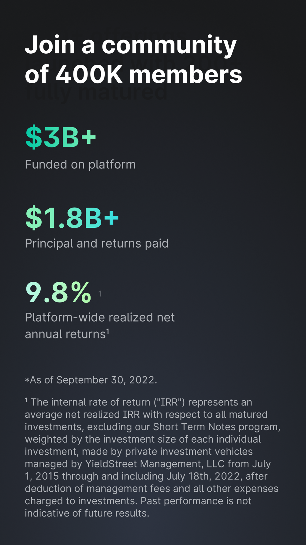Yieldstreet Management, LLC is an SEC registered investment adviser. Investing in securities involves risks, and there is always the potential of losing money when you invest in securities. Past performance is not a guarantee of future results. Before investing, consider your investment objectives and Yieldstreet's charges and expenses. Not an offer, solicitation of an offer, or advice to buy or sell securities. All images and return figures shown are for illustrative purposes only, and are not actual customer or model returns. Visit Yieldstreet.com for more information.
