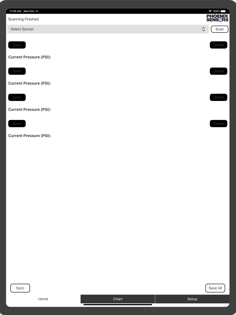 This Apple software is used with the Phoenix Sensors WEPS04 Pressure and Temperature transducer. It allows users to monitor up to 4 sensors at one time, with update rates as fast as 5 milliseconds (200hz). It displays both pressure and temperature information for observation. The software also allows the user to synchronize all four sensors to within 25 milliseconds of one another. The user may also save data to the Apple device as a .CSV (comma delimited) file where one can analyze the data in an excel spreadsheet (or similar).