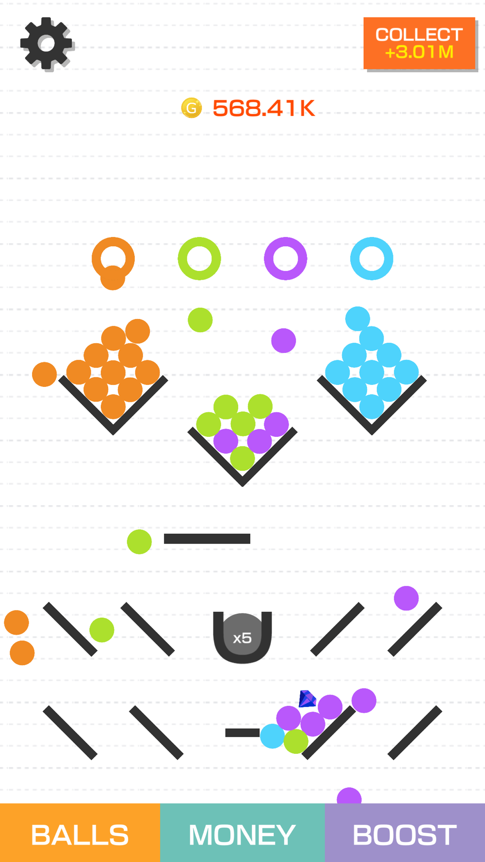 Collect gold and grown the ball, aim for the bottom layer!