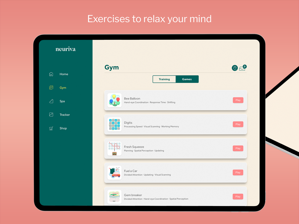 Here at Neuriva, we know that no two brains are alike. That’s why our Neuriva Brain Gym has been designed to customize your brain training experience specifically for you and your brain’s needs.