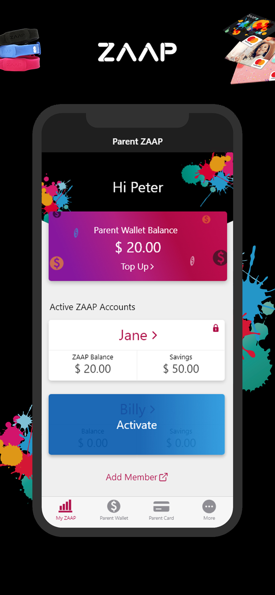 ZAAP is a leading edge digital tool for parents and children. Better than a debit card, it is a Mastercard Pocket Money Card and/or Wearable Payment Band supported by our innovative App.