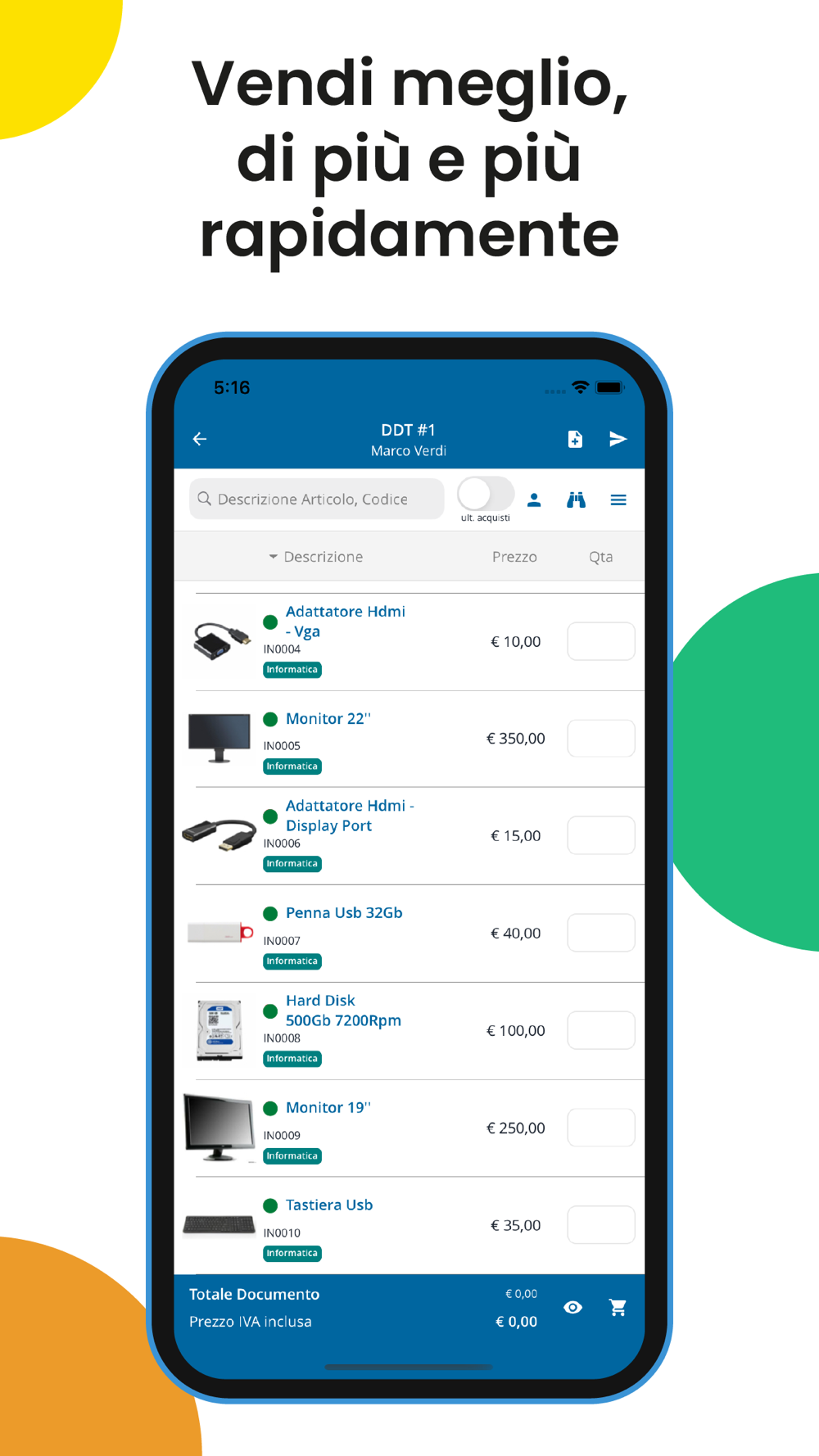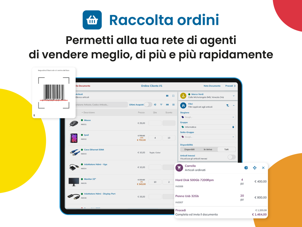 • Gestione Ordini: permette la raccolta e la gestione degli ordini direttamente dal cliente, fruibile anche offline e gestisce contestualmente anche le anagrafiche dei clienti