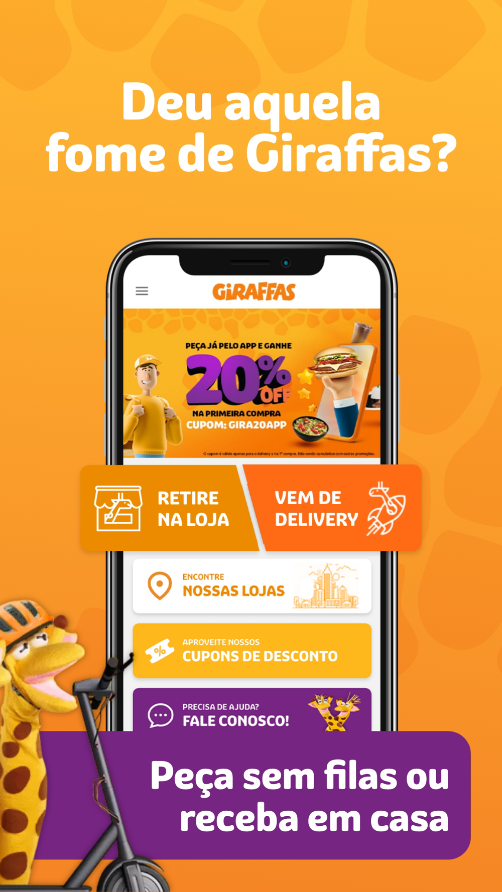 O app Giraffas foi pensado para trazer conforto e inovação para você e sua família. Do seu celular você faz o pedido e paga, decide se prefere retirar seu pedido no balcão ou se quer que seja entregue, e então... PRONTO! Sem fila é bem mais legal.