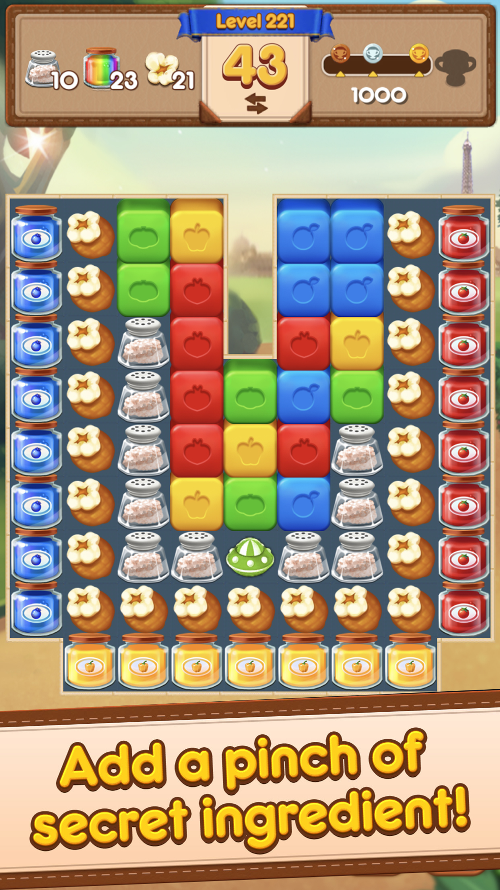 Chef Josh has a dream, and that dream is to become the one and only Blaster Chef. But the only way to claim such an amazing title is by becoming the very best cooking collapse puzzle solving chef out there! It's not enough to be cooking average food. The food, like the chef's collapse puzzle skills, needs to be the best! So together with his pet cat Sam and gourmet pigeon Pesto, Josh is traveling through the streets of Paris in search of the best recipes and fresh and new cooking ingredients. But he can't do it all by himself! He needs your help to solve a variety of cooking-themed puzzles, blast away and collapse the food blocks, and in the end become the real Blaster Chef.