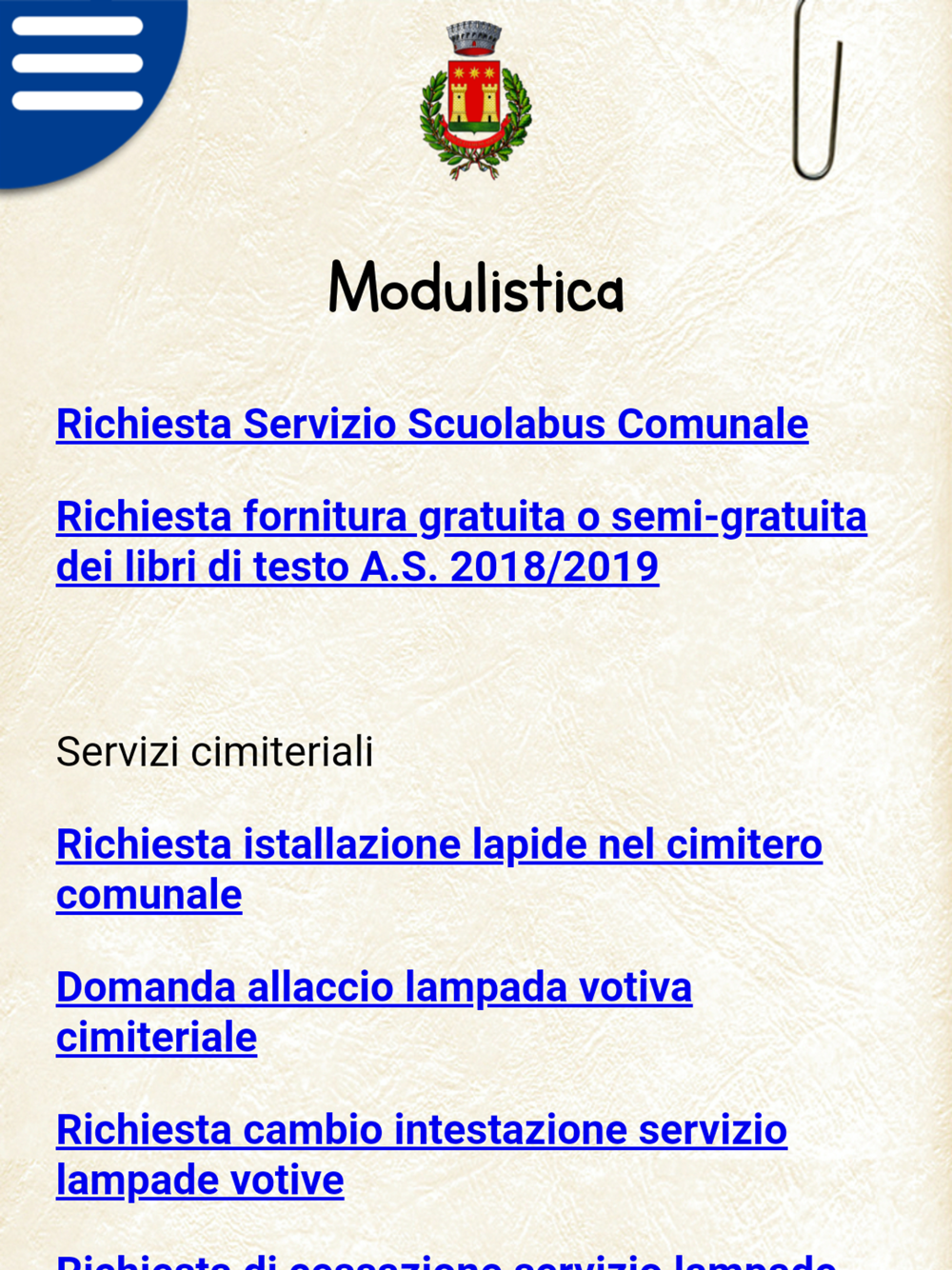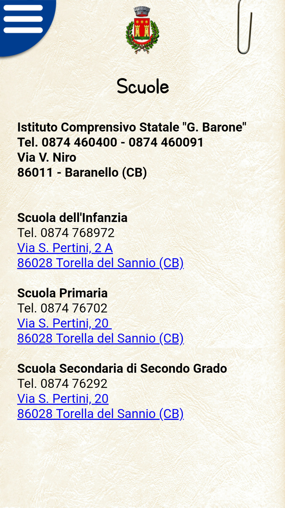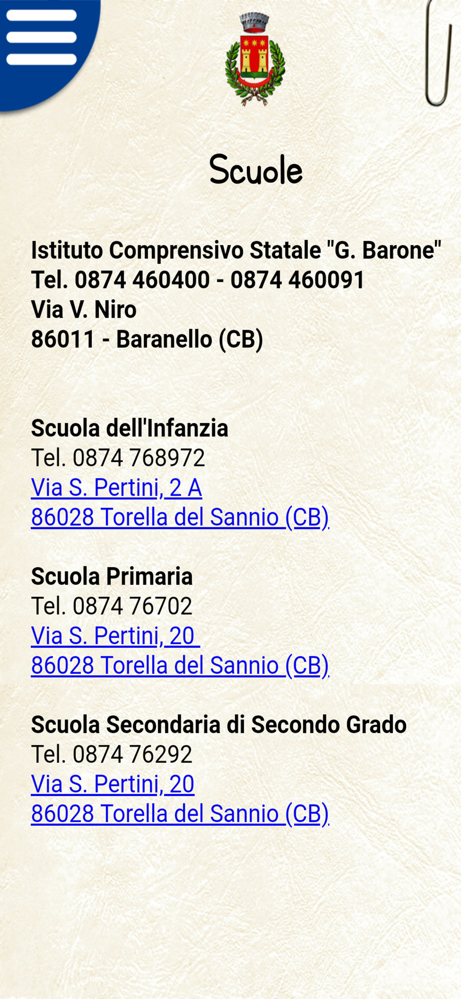 Attraverso l'app ufficiale del Comune di Torella del Sannio potrai essere sempre aggiornato su ciò che accade nel paese, per gli eventi, le sagre, ma potrai anche dialogare con il comune. Infatti attraverso la sezione modulistica è possibile inviare le tue richieste direttamente all'amministrazione comunale. Avrai a disposizione tutti i servizi al cittadino, a portata di cellulare. Ma se sei arrivato da poco nella città di Torella del Sannio, l'app ti indicherà i posti più significativi da visitare. Il virtuoso comune ecofriendly di Torella del Sannio inoltre è molto sensibile al tema della raccolta differenziata e nell'app troverai una sezione apposita per conoscere le regole e i calendari della raccolta, e anche dove ritirare gratuitamente i sacchetti. Se vuoi visitare Torella del Sannio ma non sai come, l'app ti trova anche la strada giusta!