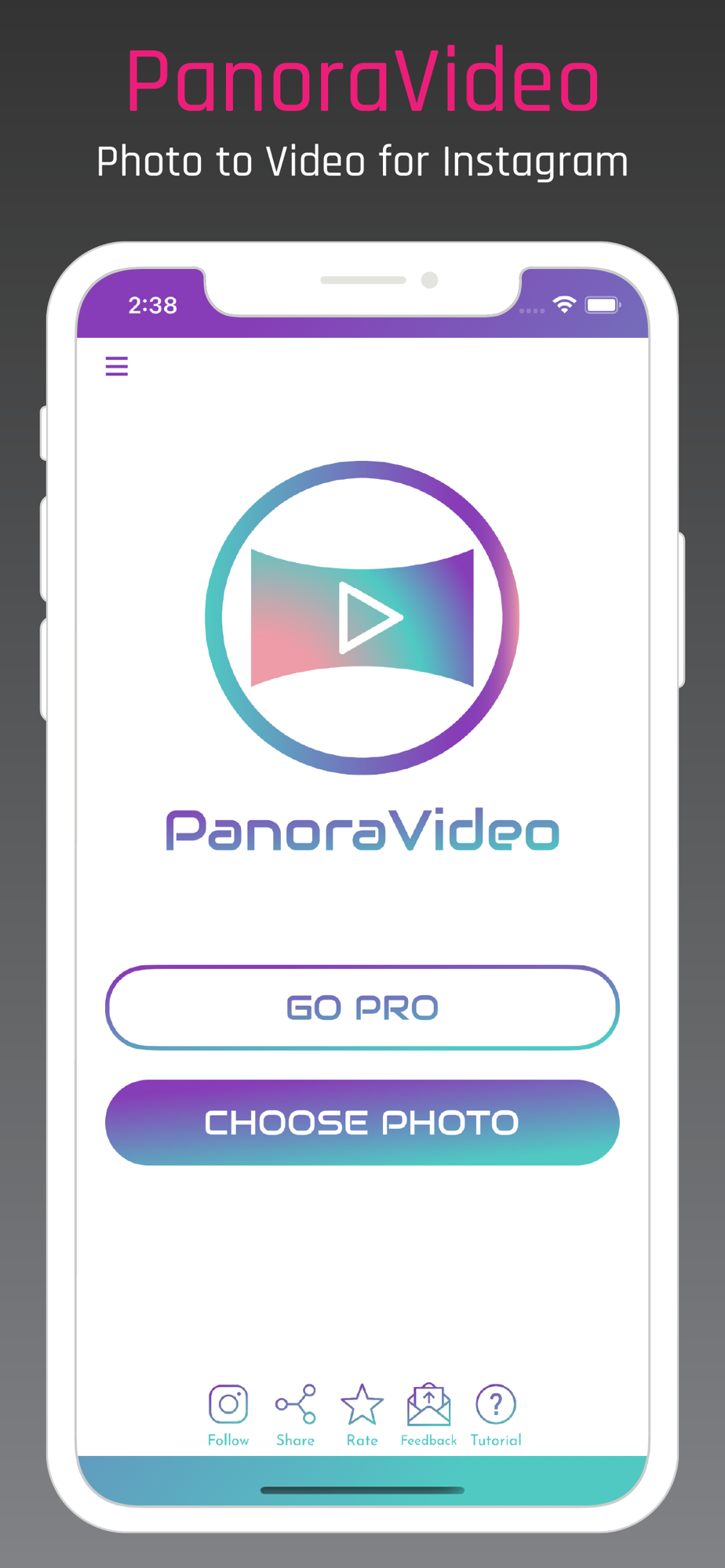 With PanoraVideo, you simply chose a photo from your photo library; choose the orientation and video direction; customize the aspect and part of photo you want to convert in to video. You divide the speed/length fo the video. Preview the video as you like and once happy, creat the video and directly post on Instagram.