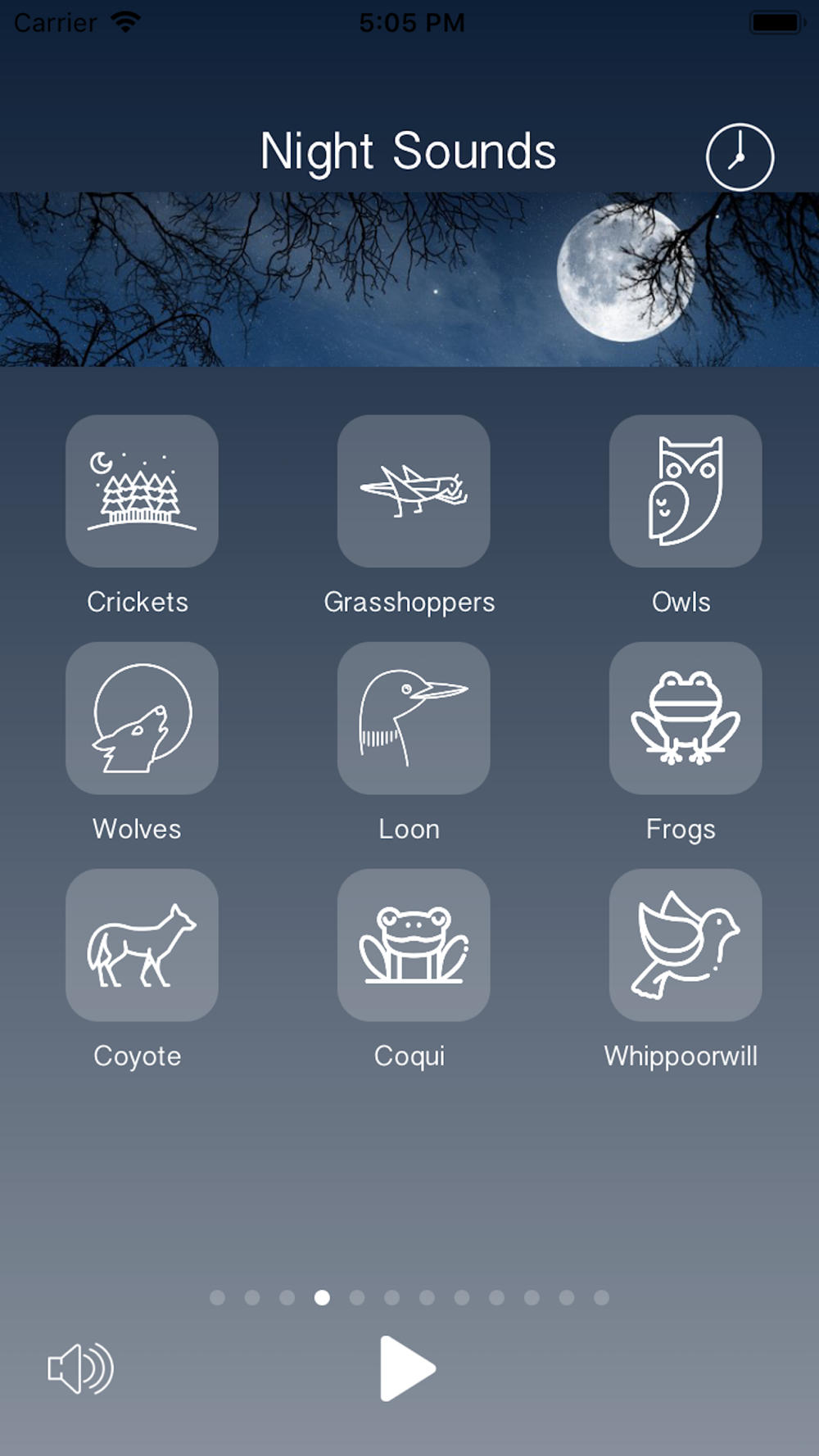 Night sounds (Crickets, Grasshoppers, Owls, Wolves, Loon, Frogs, Coyote, Coqui, Whippoorwill)