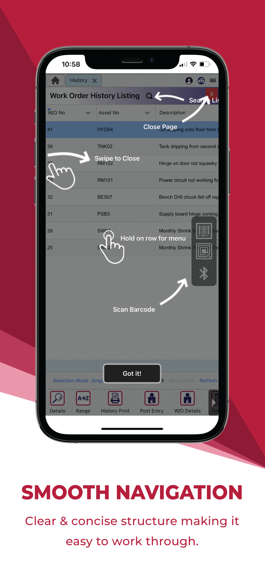• Offline Functionality – Your Maintenance shouldn’t be limited to how far your internet reaches. The MEX App handles all different connections and scenarios, it will download the data that you need to your device and sync the data when it has a connection