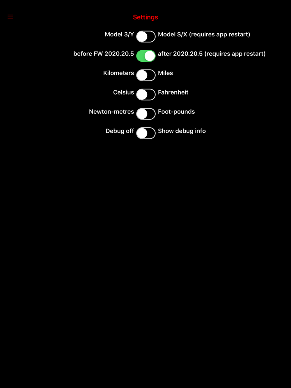 Information shown in this app was not meant for the public and may be inaccurate, subject to change or disappear as the car gets software updates. This information is presented for entertainment purposes, and for learning more about how your car works. The app can stop working at any time due to firmware changes in the car, or for other technical or legal reasons