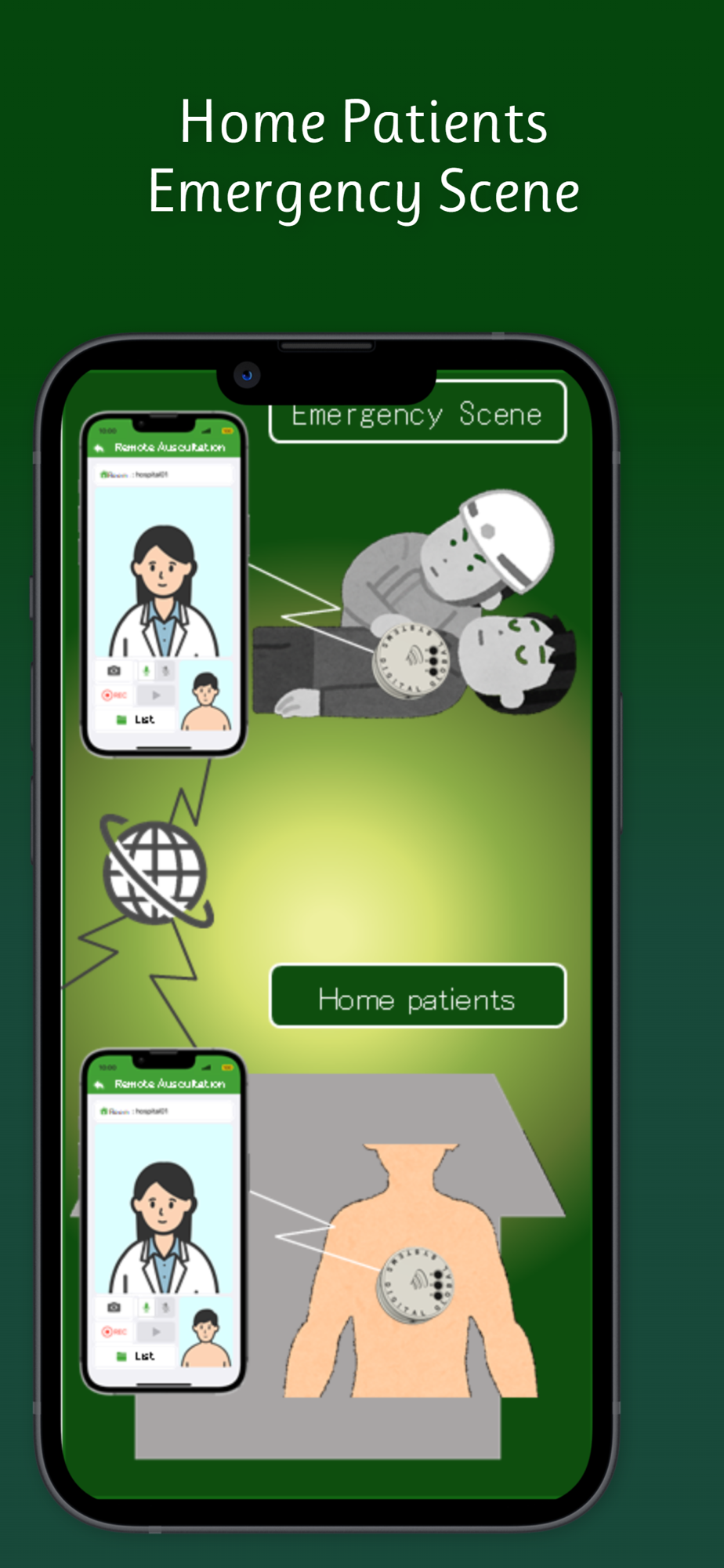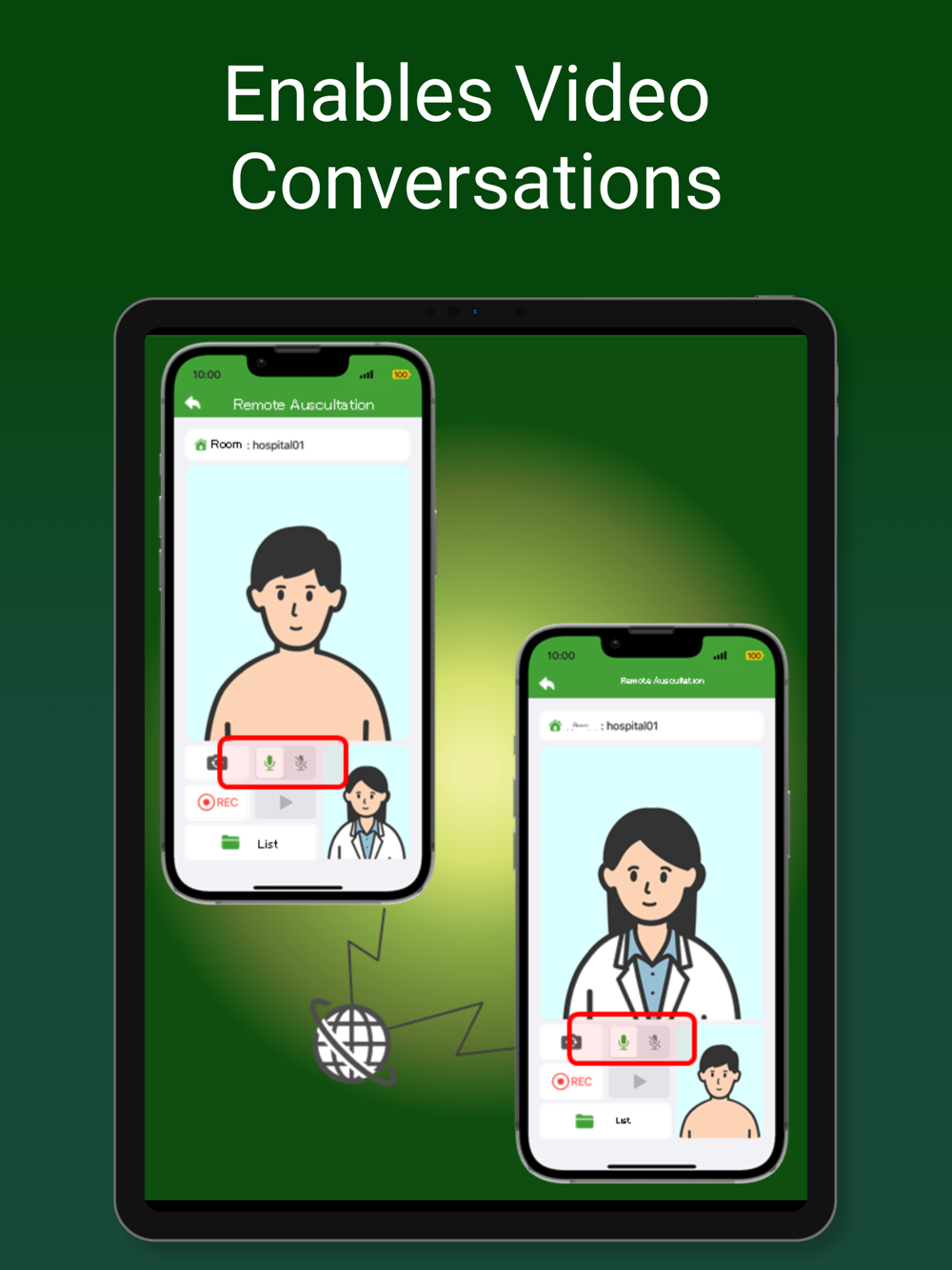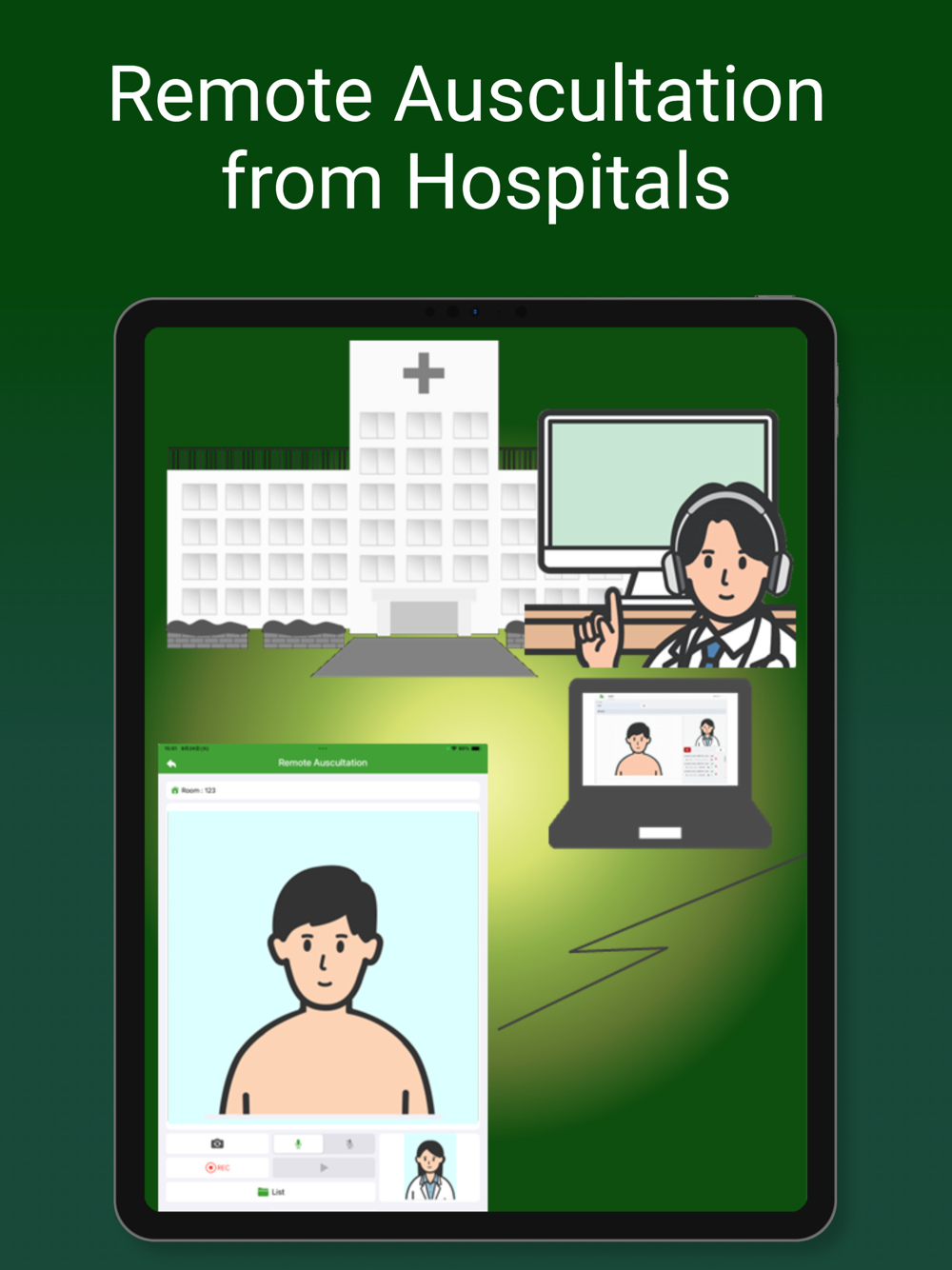 This app responds to situations where doctors who treat patients in aging societies, rural areas, and remote islands cannot examine them immediately. Not only can it be used to treat patients at home, but it can also be used to perform remote auscultation between disaster sites and hospitals, making it an effective means of initial examinations. Furthermore, in the event of an infectious disease outbreak, doctors can remain in the safe "green zone" while only fully protected personnel in the high-risk "red zone" can auscultate patients, allowing multiple doctors to perform auscultation quickly and safely while preventing secondary infection.