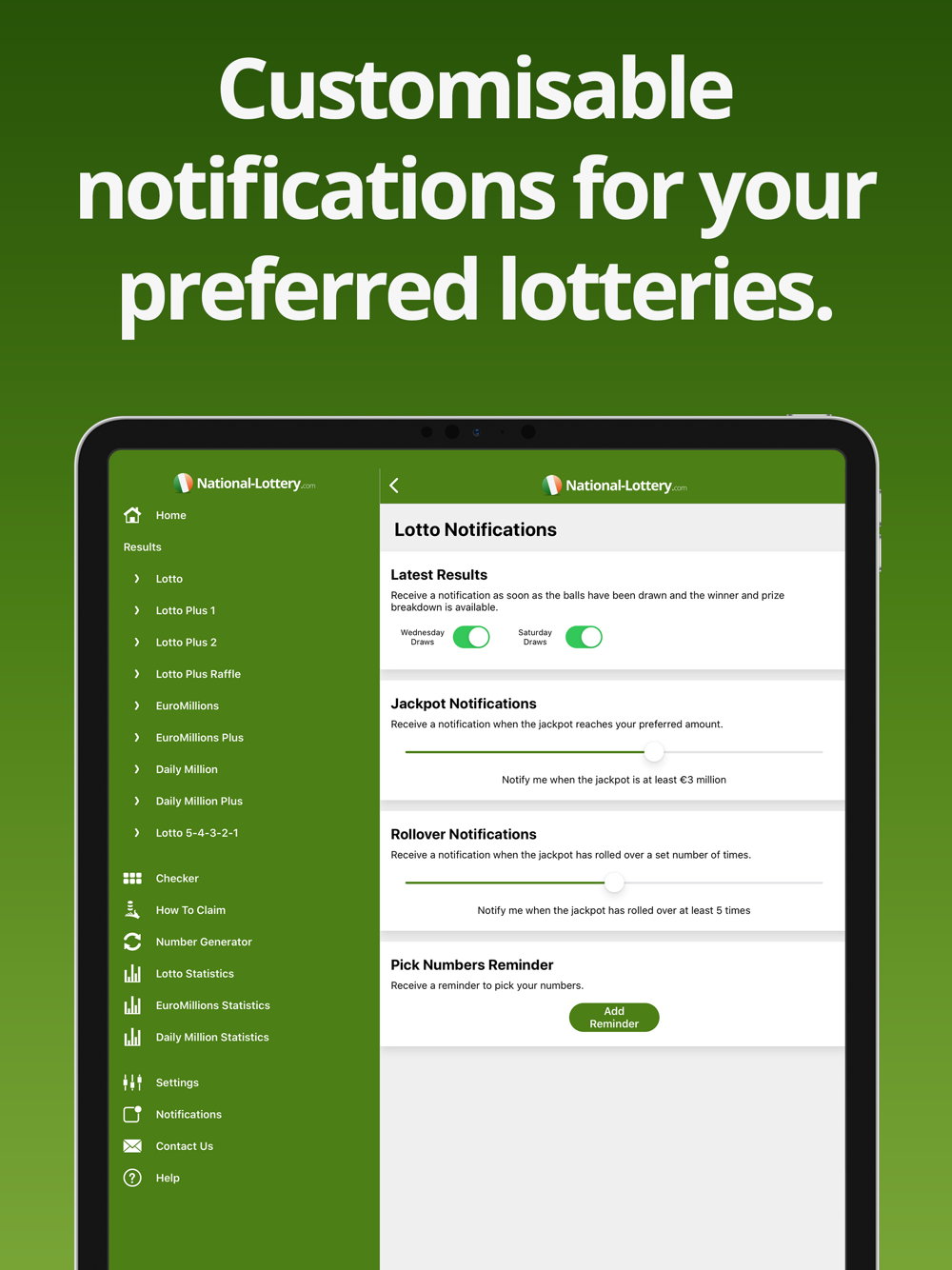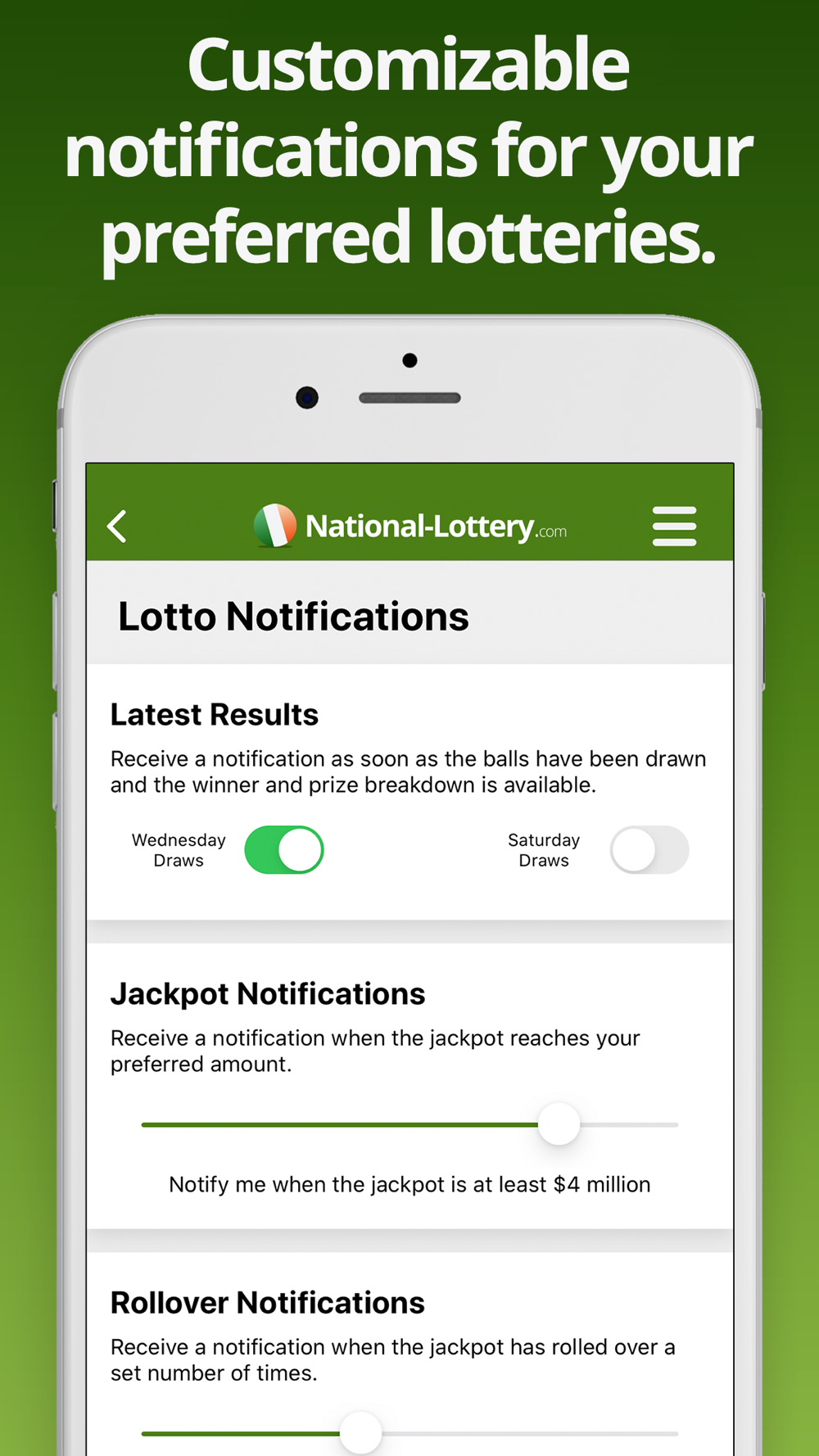 Get notified instantly when the latest lottery results and prize breakdowns become available. The App allows you to customise notifications for specific lottery games and you can also choose which days of the week you play. Want to know when the jackpot has rolled over or has reached a certain amount? Just head to the Notification section of the app to set up your alerts. There is also the option to set notifications at times that suit you - great for reminding you to purchase tickets before the draw.