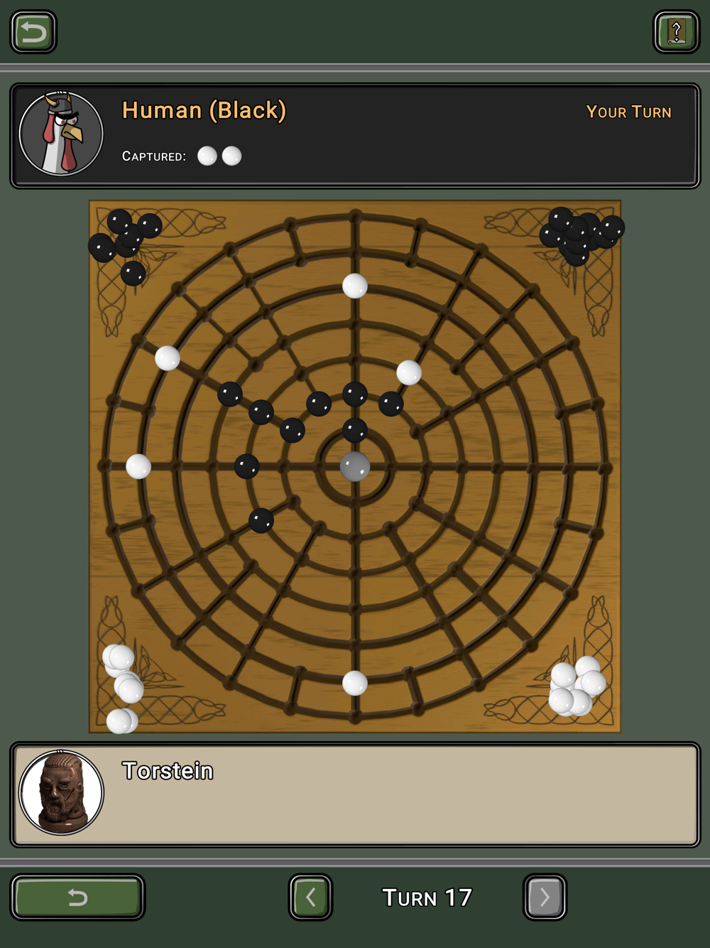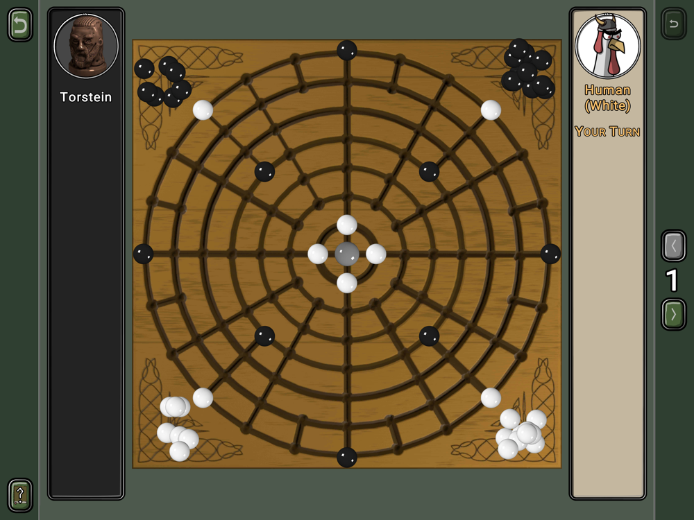 The app features two variants of the game: the basic edition which is easier to understand and where both players are treated equally and the advanced version which has different goals for both players. The general goal is to connect the central Naval stone with the border of the board by forming a connected line of stones.