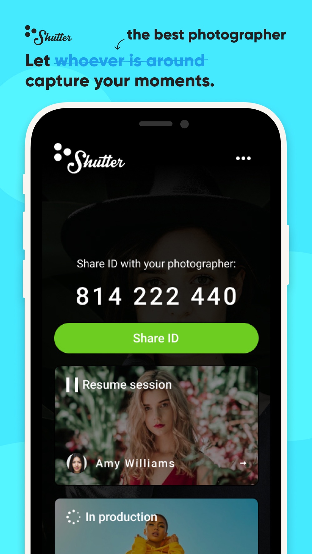 We are a hub you can use to create new pictures together remotely. The quick and easy way to have a shoot through your phone virtually. Shutter App is a free and powerful app that empowers you to have a professional Virtual Photoshoot with high quality pictures.