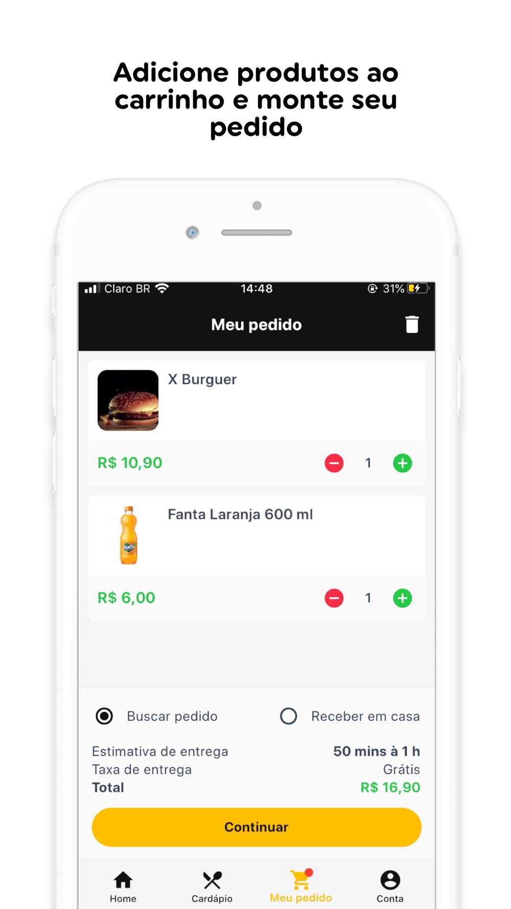 No app, você encontra de forma rápida o cardápio completo e ainda pode utilizar a ferramenta de busca para localizar diretamente os produtos que você deseja.