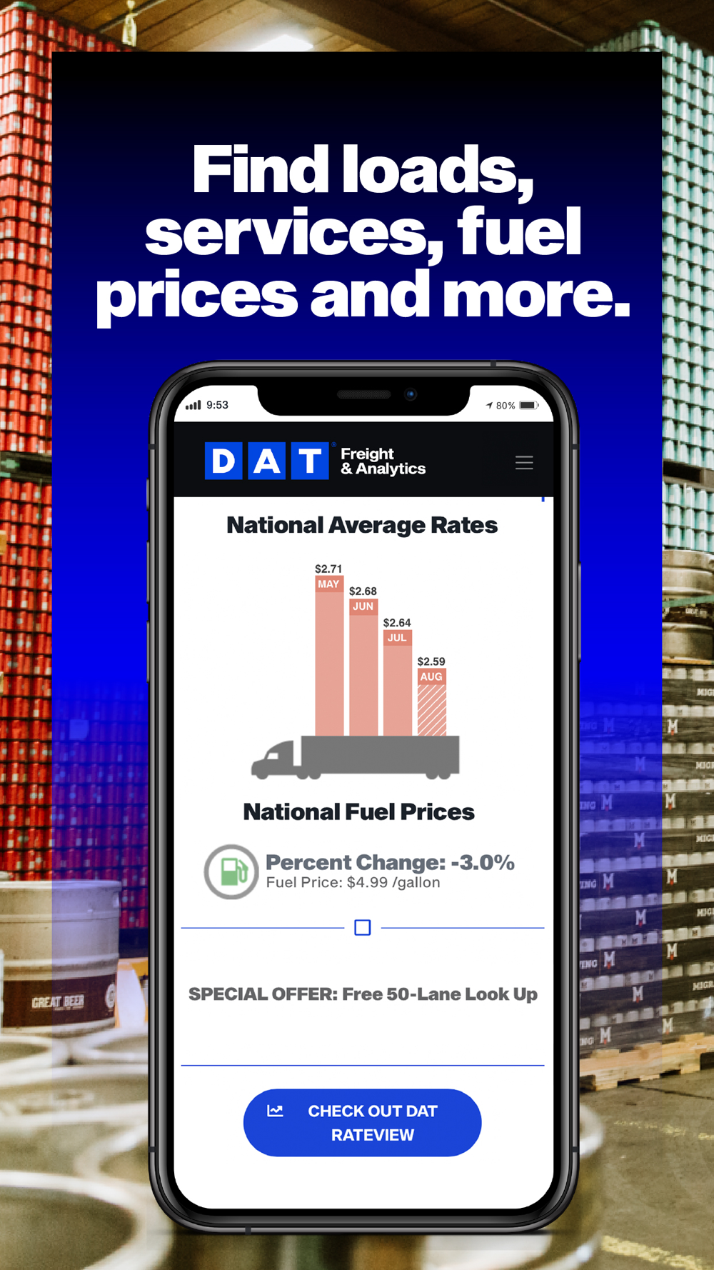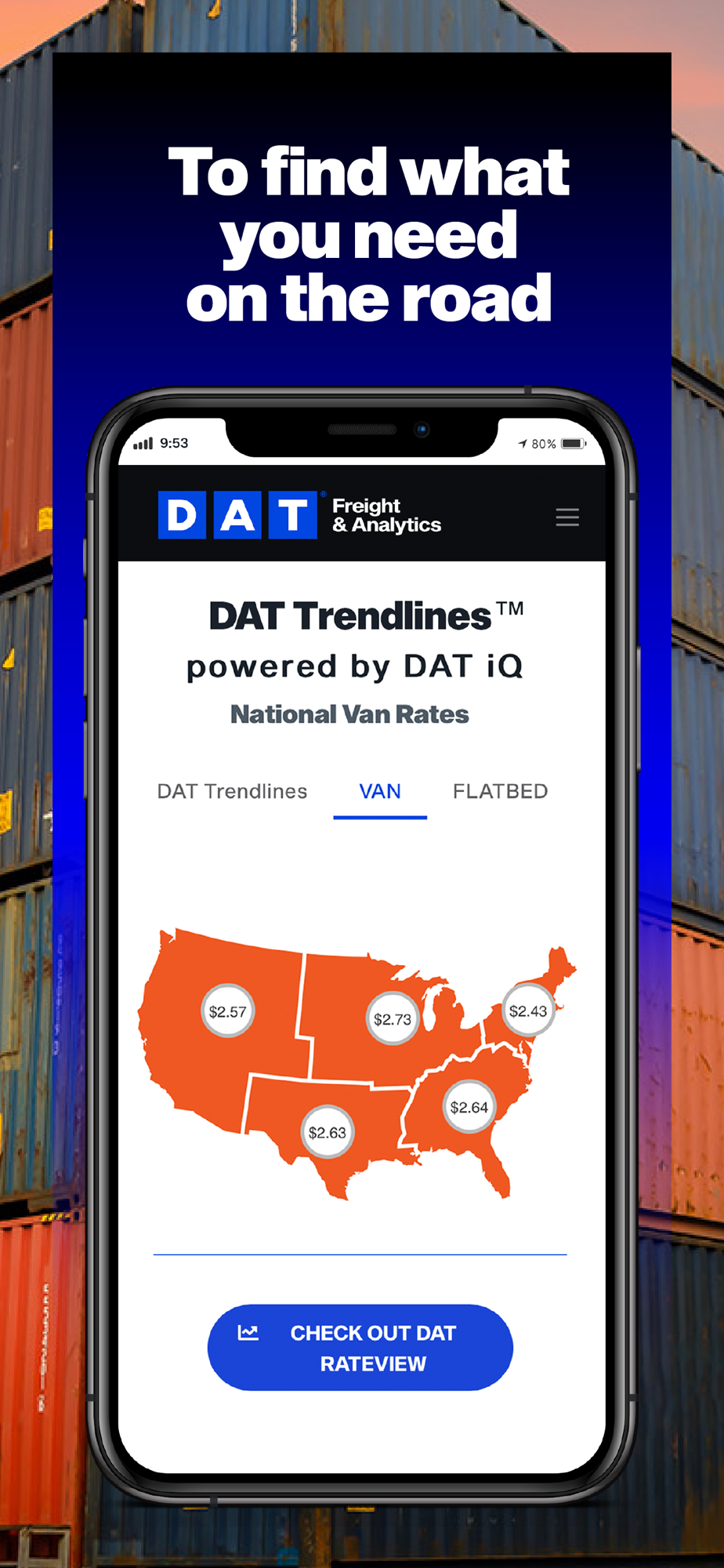 In addition to finding loads and truck amenities, you’ll have access to the most accurate market rate data, tools, and insights to forecast and negotiate from a position of strength. Get the load you want at the price you need with the DAT One app for truckers.