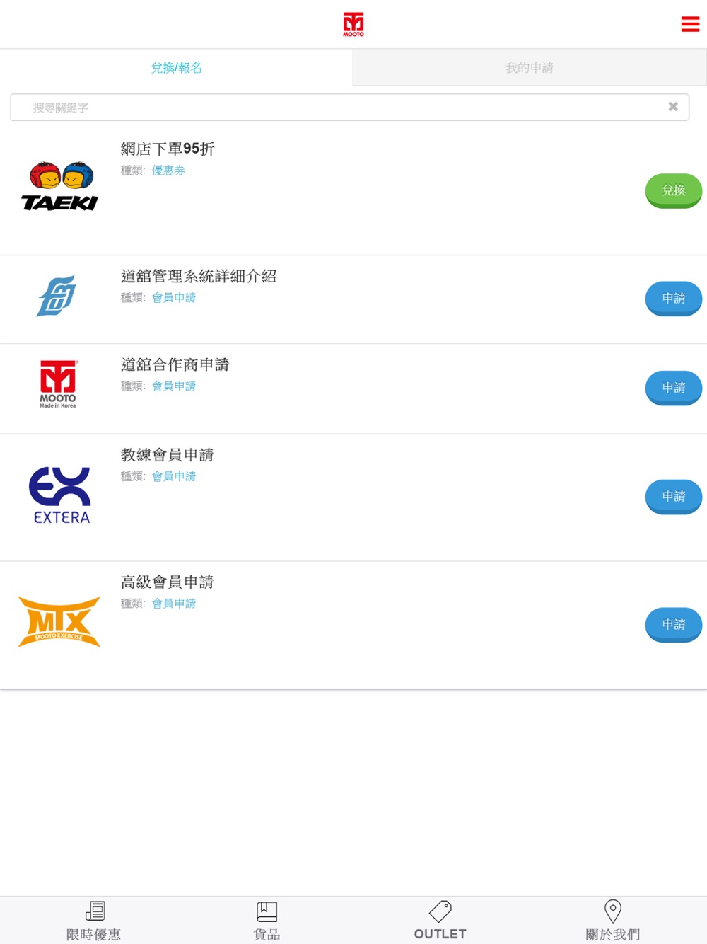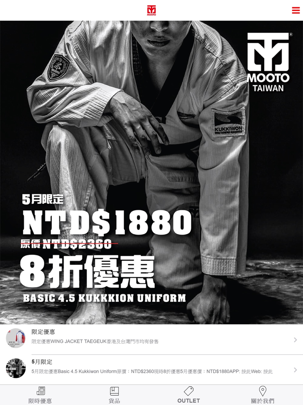 MOOTO 為韓國知名武術用品品牌,是WT認可的指定品牌之一,為全世界提供專業的跆拳道產品,包括:跆拳道道袍,訓練護具及裝備,道館場地設備及休閑服裝等。著重產品的品質和舒適度,追求產品與身體的同調,使運動員在運動其間能一直訓練與打破自身不足,達致精神與身體的完美結合。