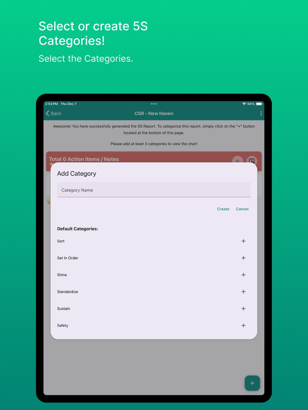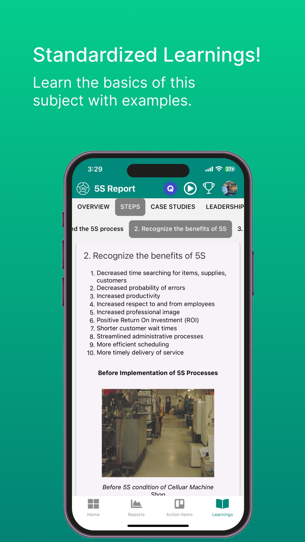 Beyond educational purposes, this app provides suggested activities for each 5S (or 6S) step for a customizable and standardized use of a 5S report and Action Item tracking.