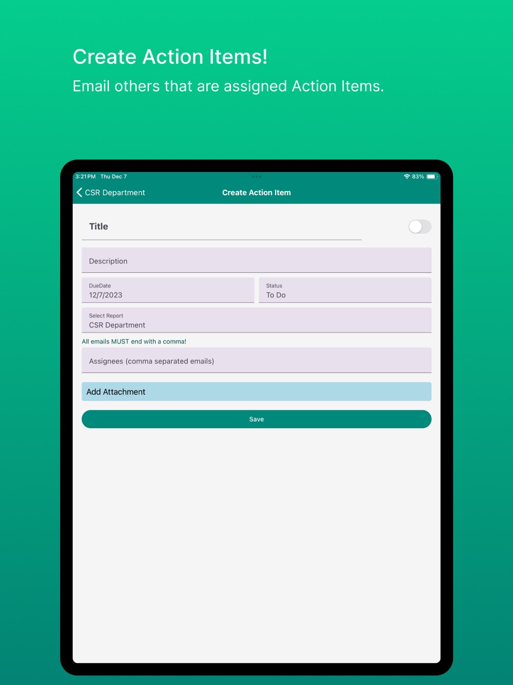 The Dynamic Kanban Action Item Board allows Action Items to be visually managed using 4 “buckets” of To Do, In Progress, In Review, and Done allowing for Assignor to track progress by a simple drag and drop function to each bucket. Emails are automatically sent to Assignee(s) for all Action Items.