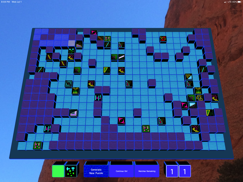 To start - tap on the Generate New Puzzle cube. Once the puzzle has generated, the way to the end is to tap on a light blue cube to set the match selection and start the match trail. A random number of widgets will also be revealed. You can click on any adjacent cube to your first one that is either blue or a match to your selection as you make a trail from your current position to one match to another match until you reach the match goal, your progress in eliminating the visible matches will show in the bottom right side. When you reach match goal, the matched cubes will be flipped to a dark color not to be tread upon and the unused cubes will flip to blue again for you to make another match selection to start the match trail. Once you have trod upon all the blue spaces turning them to the darker color that you cannot use as a stepping stone or no matches remain on the board for your selected match you will solve that particular puzzle.