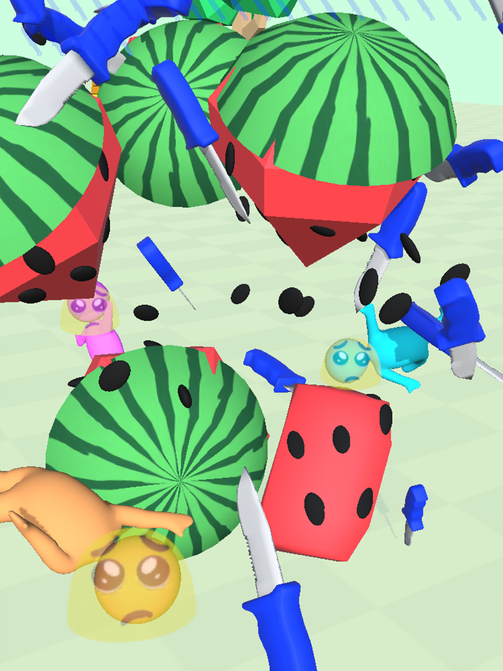 Throw the knives into the fruits to break them.
