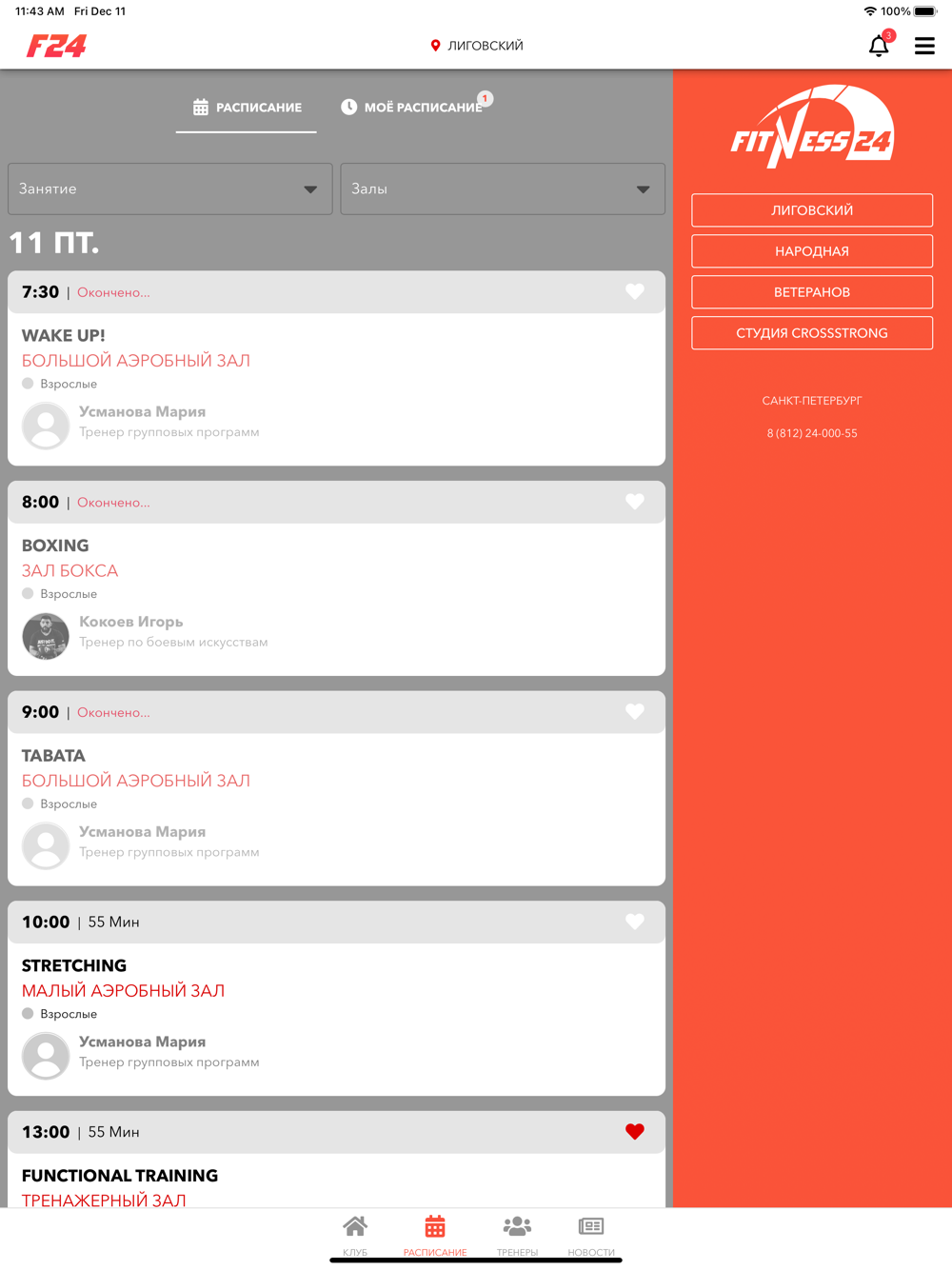 Приложение сети круглосуточных спортивных клубов FITNESS 24 (Санкт-Петербург). Предоставление доступа к расписанию занятий, новостям клубов.