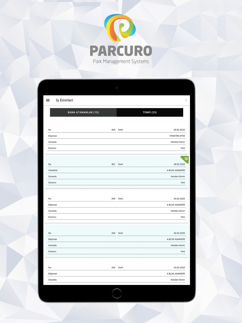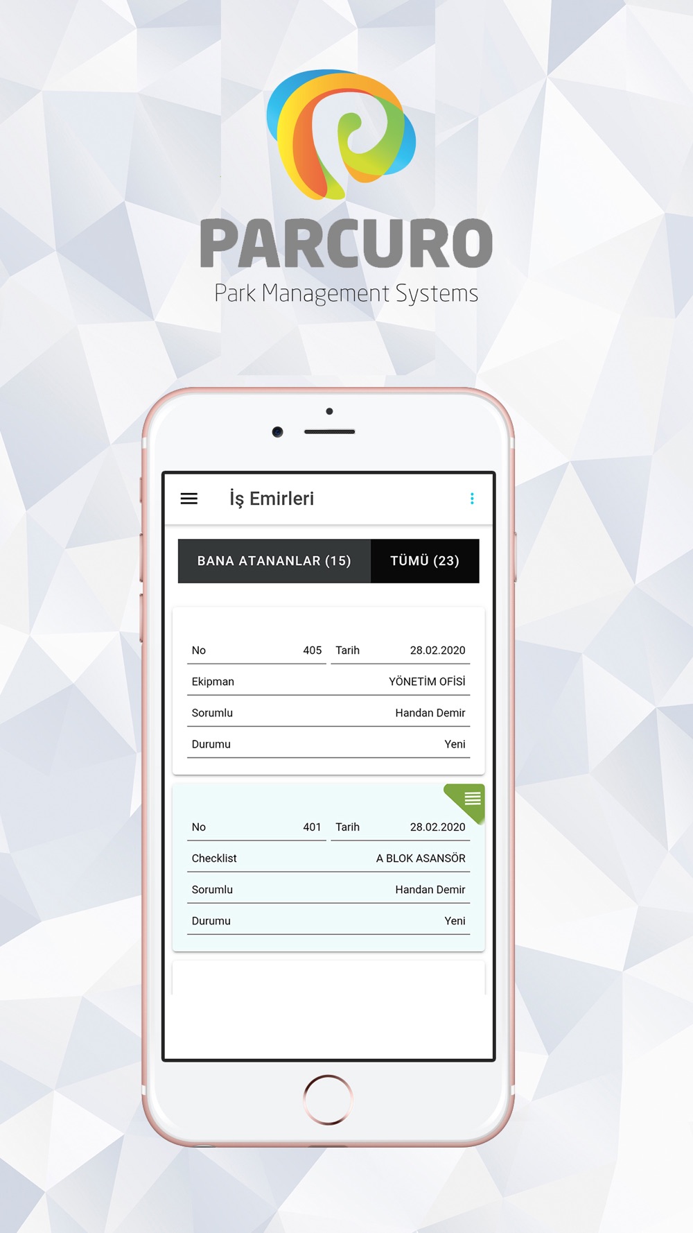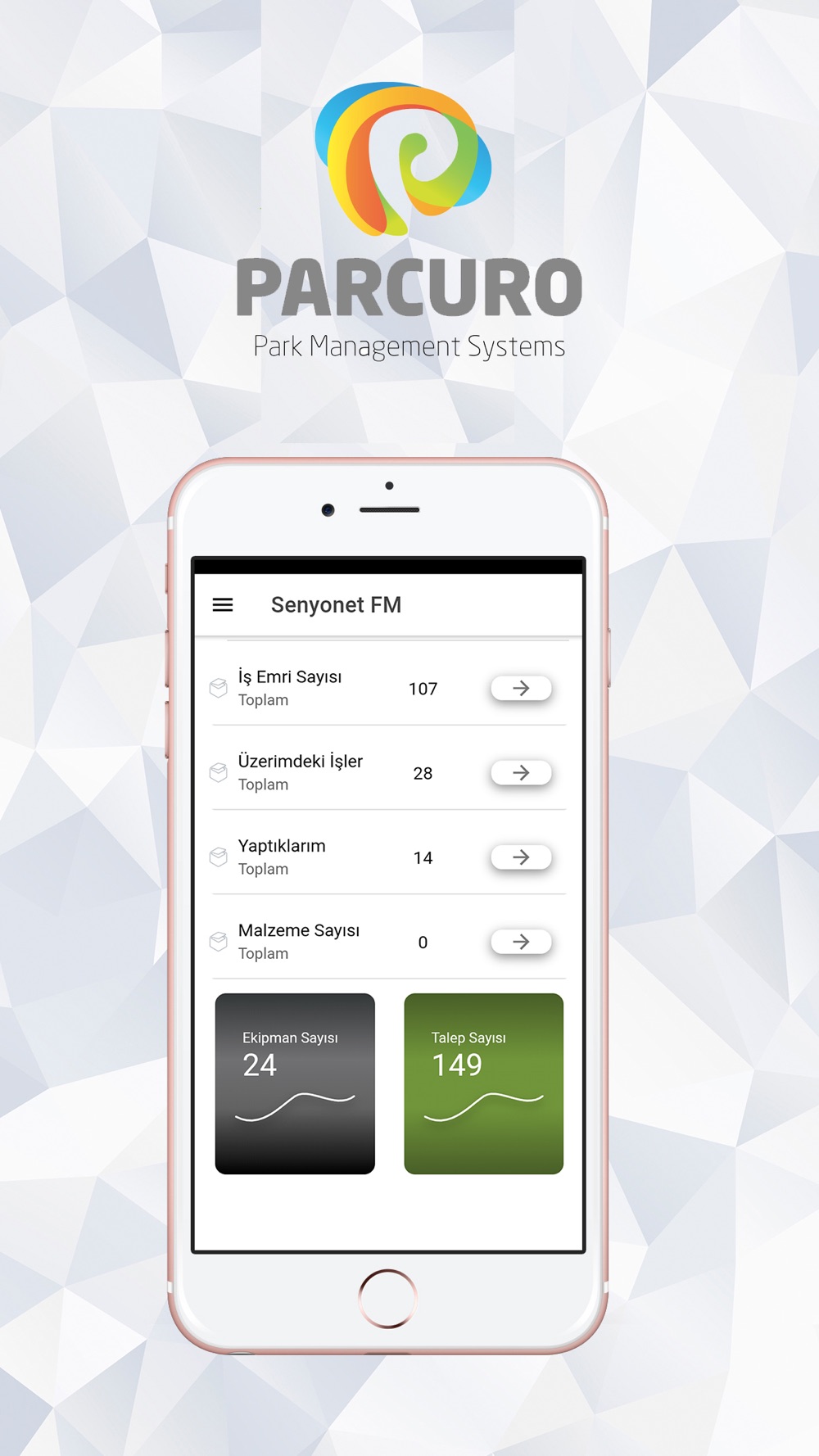 Tesisinize dair tüm teknik süreçleri mobil cihazdan kolayca kontrol edin, geliştirin ve ilerletin. Tüm bakım, onarım ve saha işlemlerinizi Parcuro üzerinden takip edebilirsiniz. Onarım ve bakım noktasında varlık hakkında doğru bilgilere sahip olmak, teknisyen verimliliğini artıracaktır.
