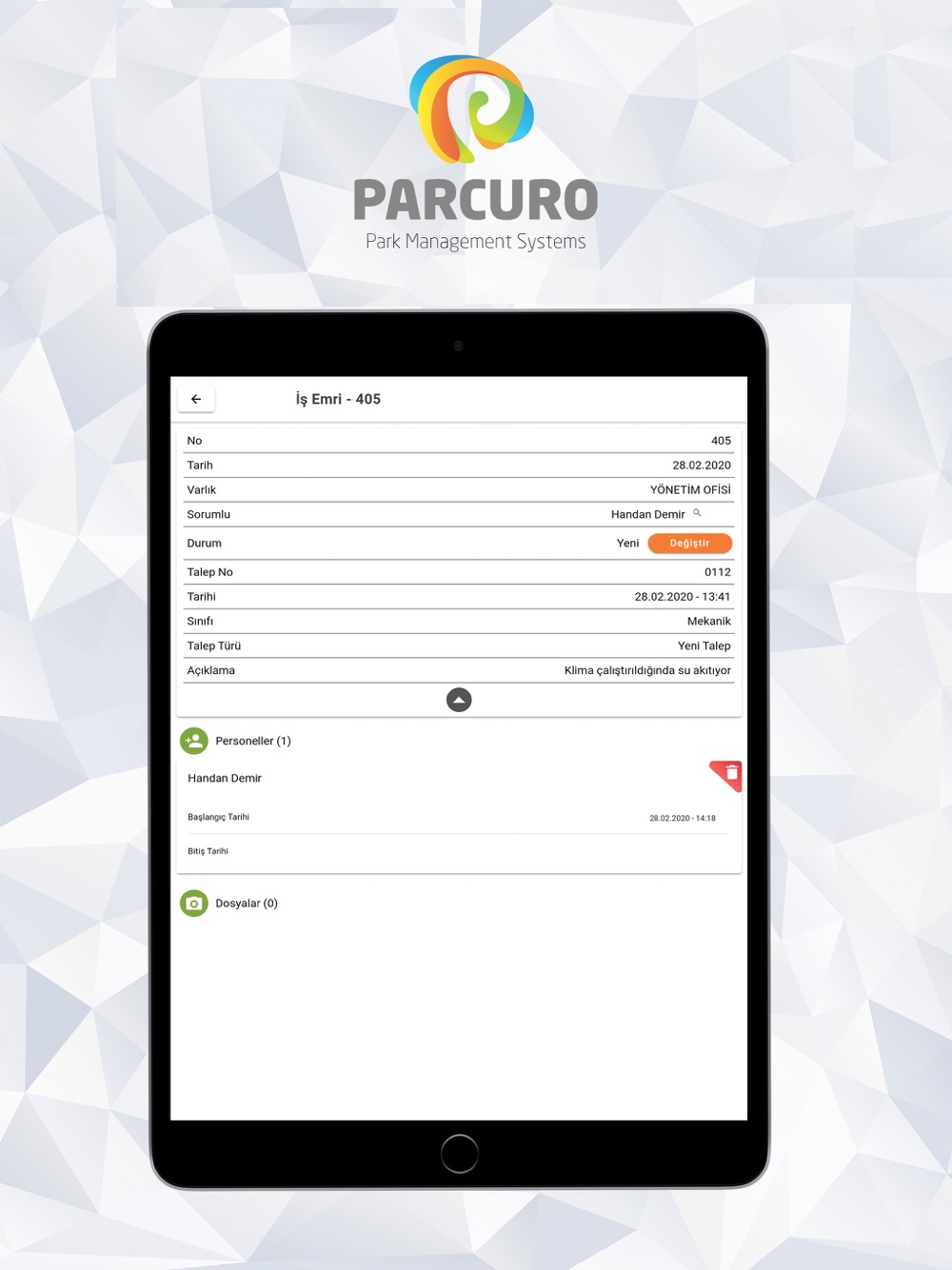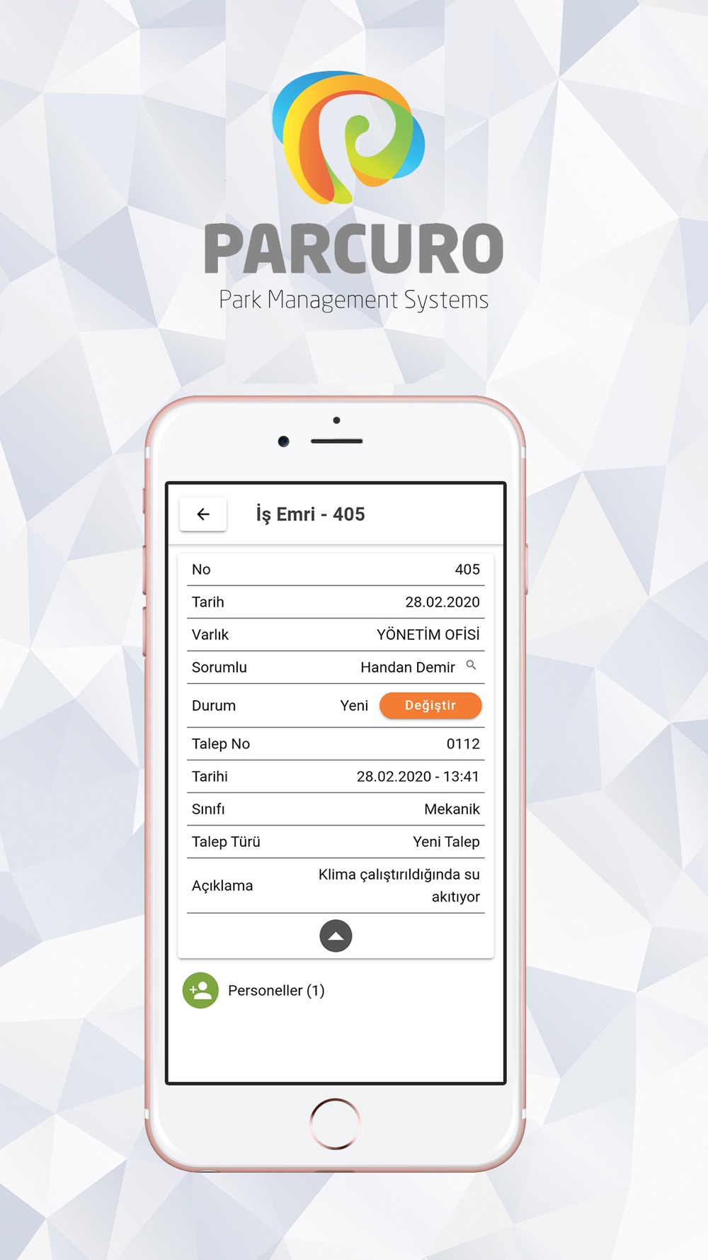 Teknik konular beklenmedik ve hızlıca çözülmesi gereken sorunlar ortaya çıkarabilir. Parcuro' nun uçtan uca çözümü ile tüm teknik problemlerinizi hızlıca mobil cihazınızdan halledin.