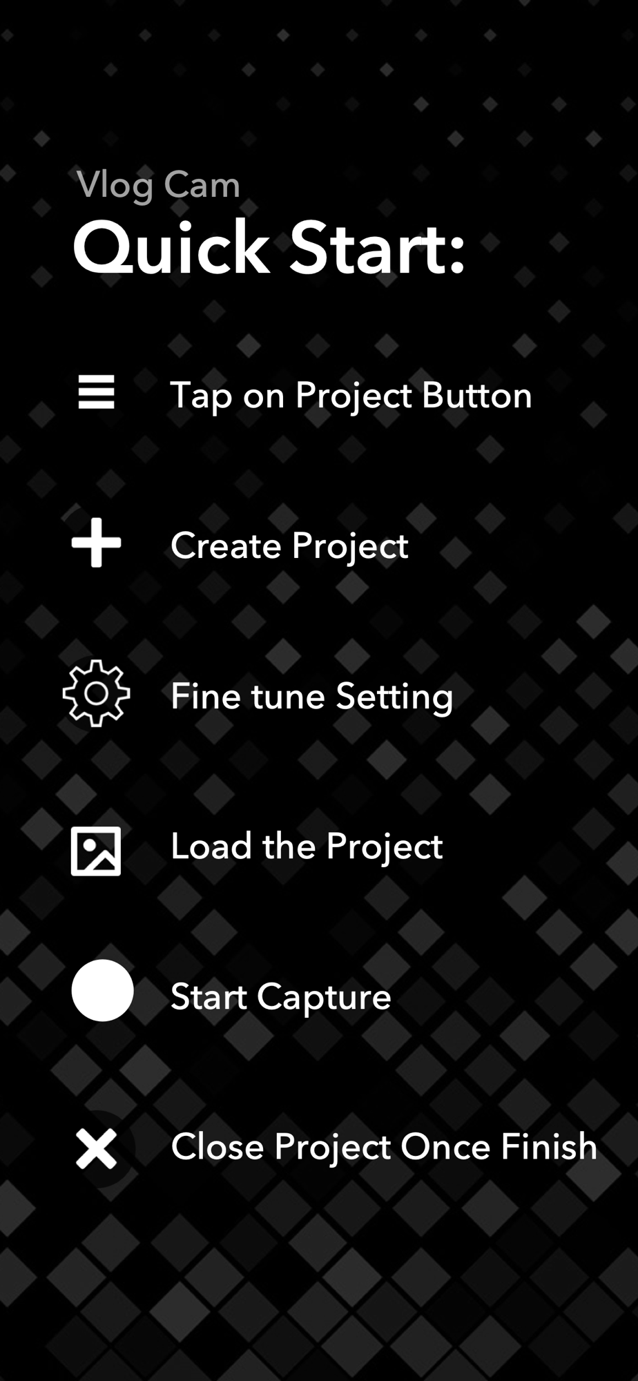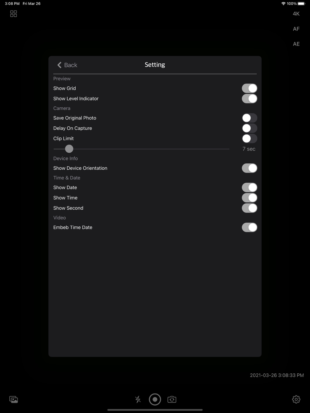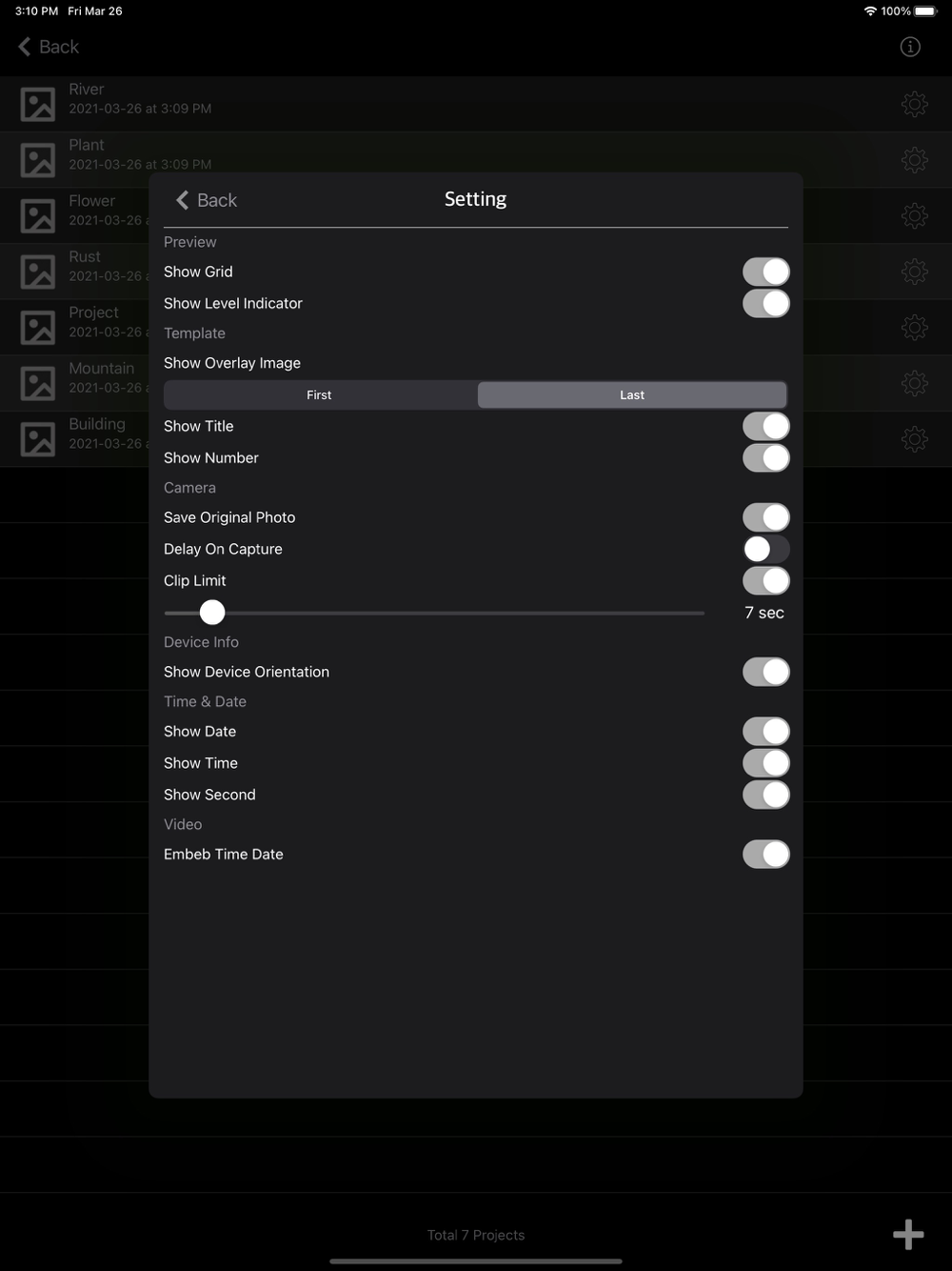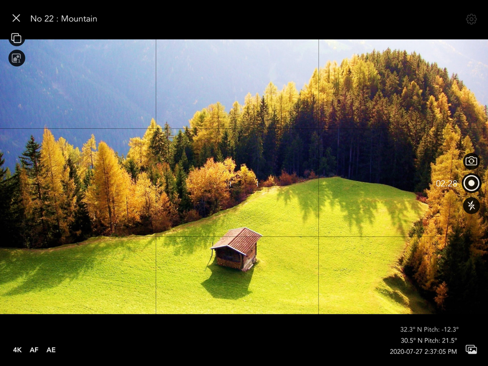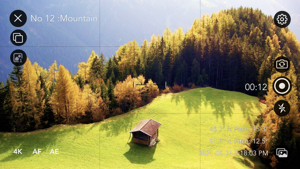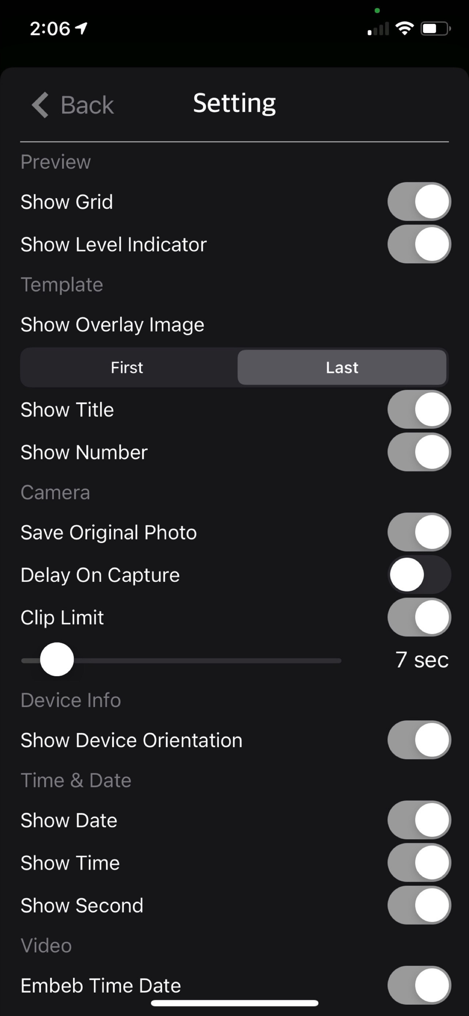 Vlog Cam enables you to capture video clip just like time-lapse. Capture video clips in the same location and orientation easily with the assist from previous photo overlay and orientation log. And by setting clip limit each video clip will capture with a specific length.