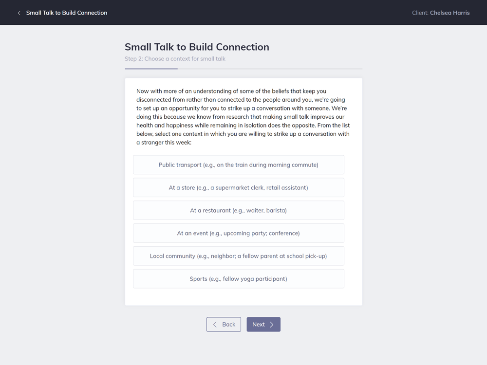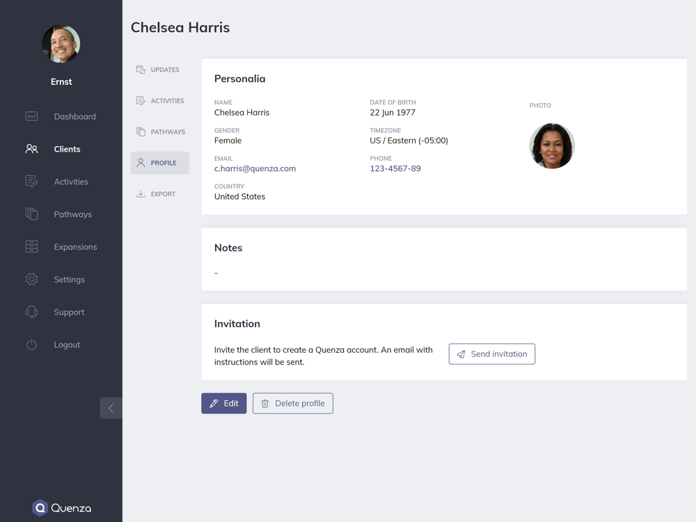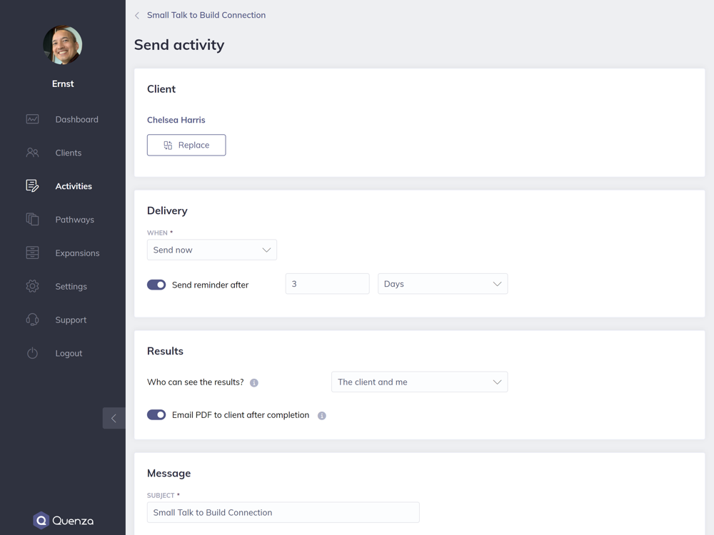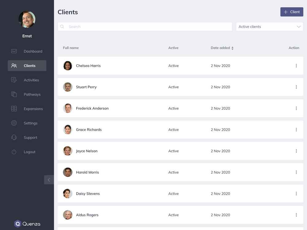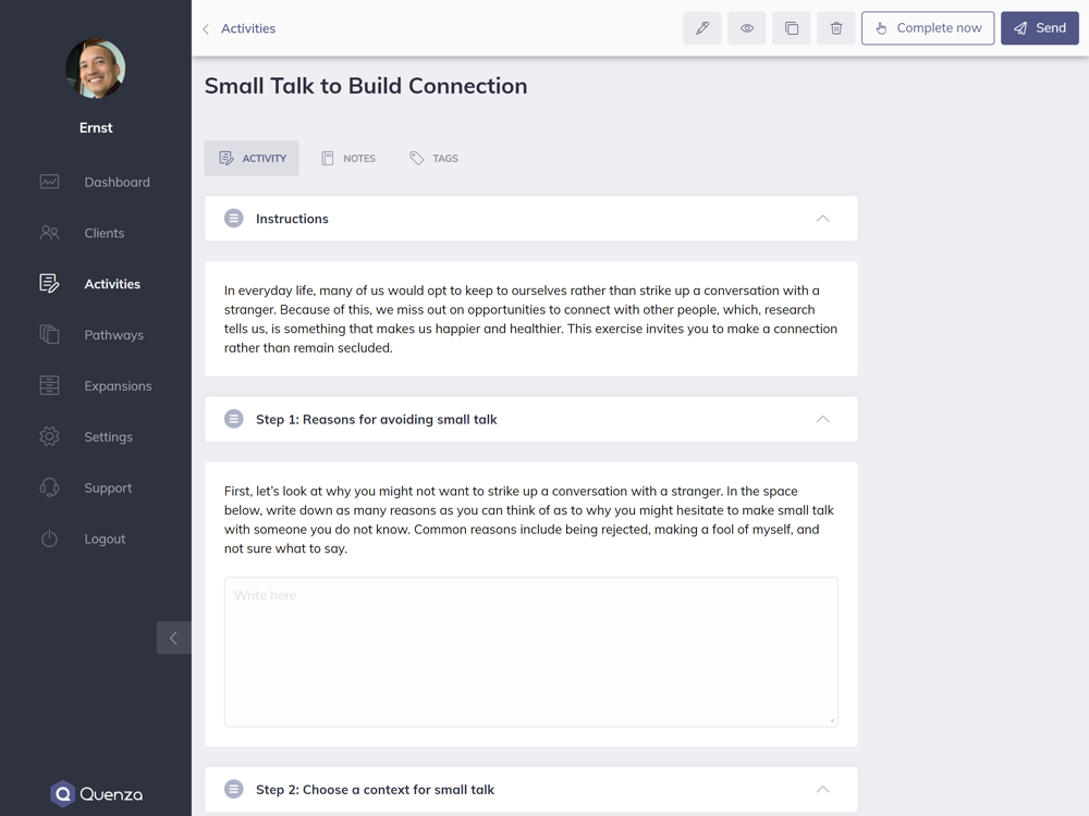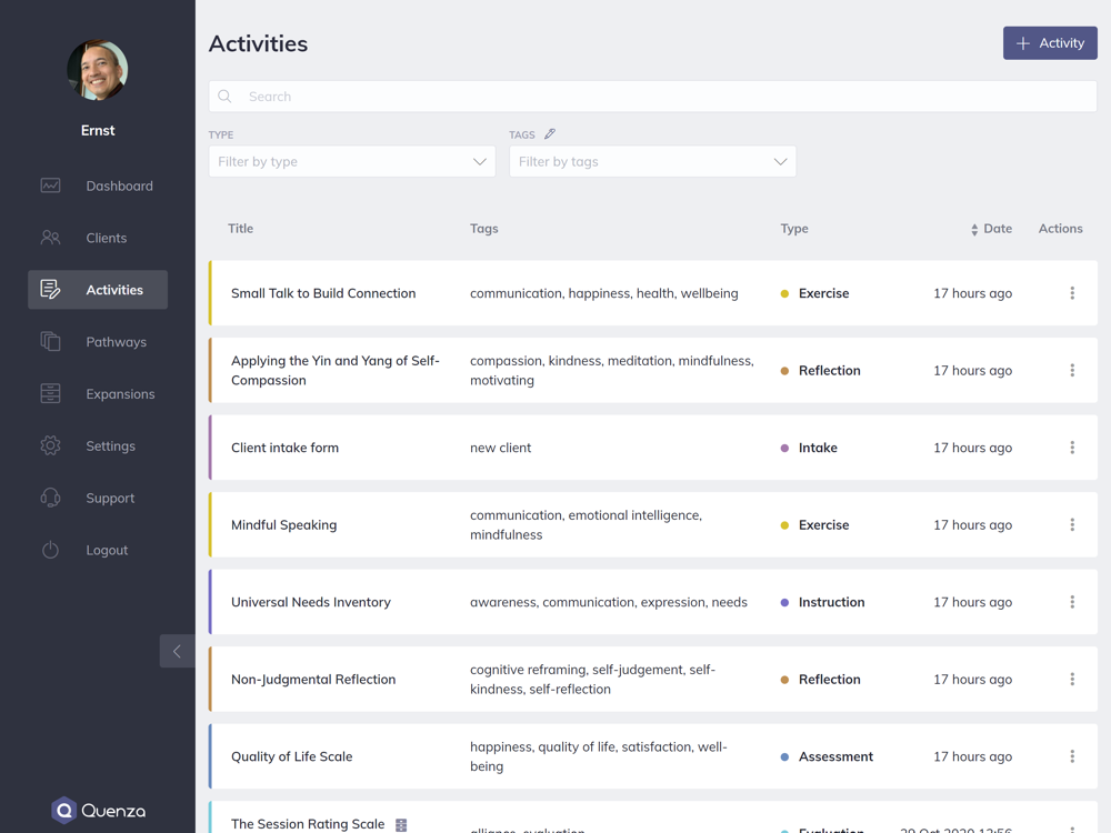 Quenza is an application for both client and practitioner. It allows professional practitioners (like therapists, coaches, counselors, and social workers) to easily build beautiful ‘activities’, such as worksheets, exercises, psycho-education, intake forms, reflection prompts, and surveys, and digitally share these with clients. These activities can be bundled into care pathways – timed series of engaging exercises that are shared with clients via email or as in-app notifications with automated reminders. All client activity and results can be accessed through the client dashboard so the practitioner can monitor and stay on top of their clients’ progress. The main reason practitioners are working with Quenza is to keep clients engaged between sessions with custom homework exercises, reflections, meditations, and interventions. Other reasons include educating, onboarding, and assessing clients, evaluating their progress or the effectiveness of sessions, or simply to inspire them.
