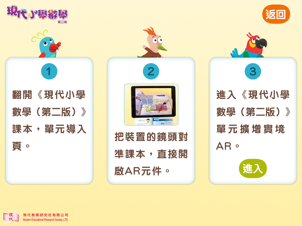 「現代小數 AR 2」App可在平板電腦或手機使用「現代教育研究社」所提供的現代小學數學AR學習資源。安裝本應用程式後,只需運用程式內的掃瞄器,對準每單元的引入頁,便可開啟生動有趣的學習內容。