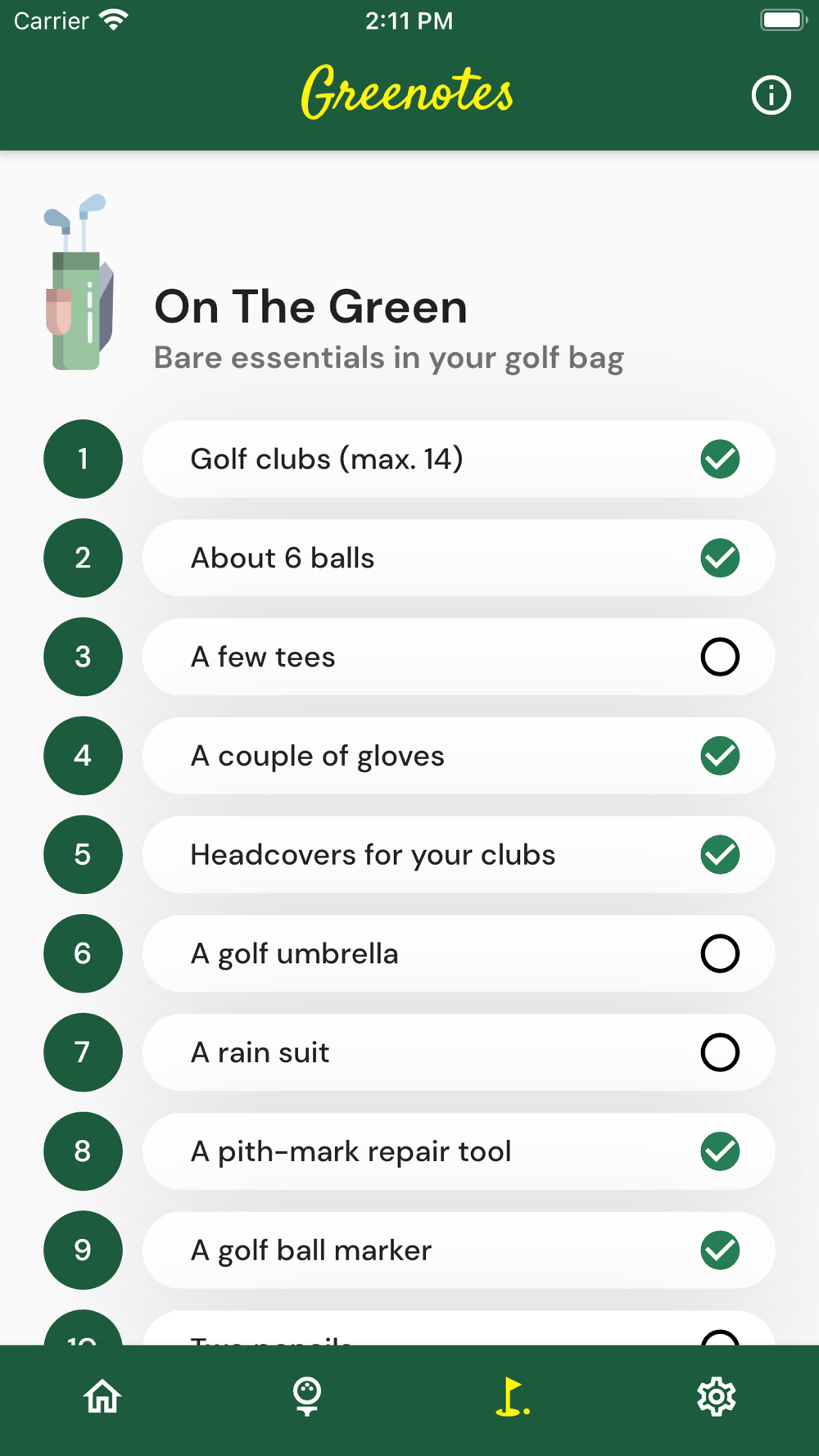 Greenotes is a fun and simple golf notes app. You can record the yardage of each golf club, see the golf club's average distance, have a checklist of bare essential items in your golf bag, and lastly back up and restore your data on your own personal Google Drive account. More features are coming, this is just the beginning! Download yours today & happy golfing!