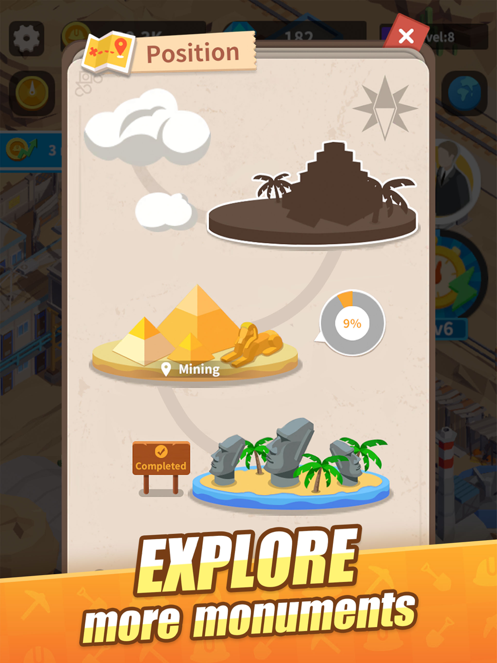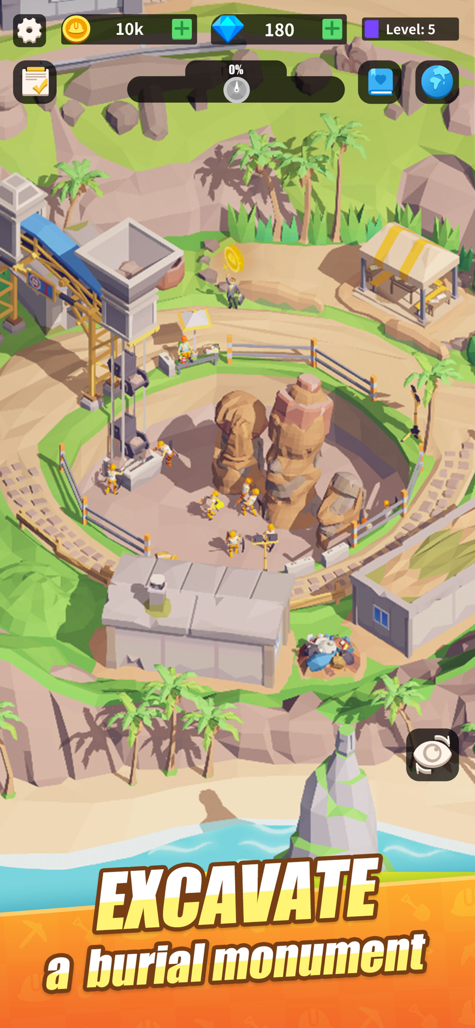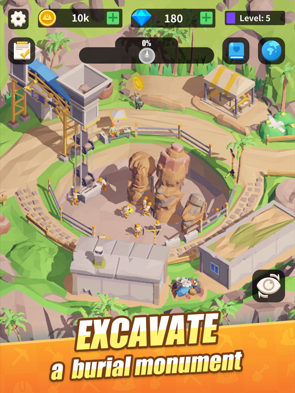 Recruit your workers and start digging! Excavate and uncover astonishing heritage sites, antiques, treasures, etc. Sell gold and diamond ore, polish your digging skills, invest like a business tycoon and hire more workers to speed up! Collect cultural relics from ancient times! Enjoy the beautiful and fascinating scenes of the historical remains!