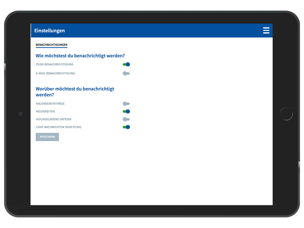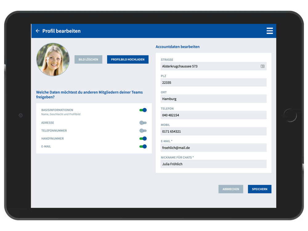- Datenfreigabe: Entscheide selbst, welche Deiner Kommunikations- und Kontaktdaten Du für andere Mitglieder Deines Teams freigeben möchtest.