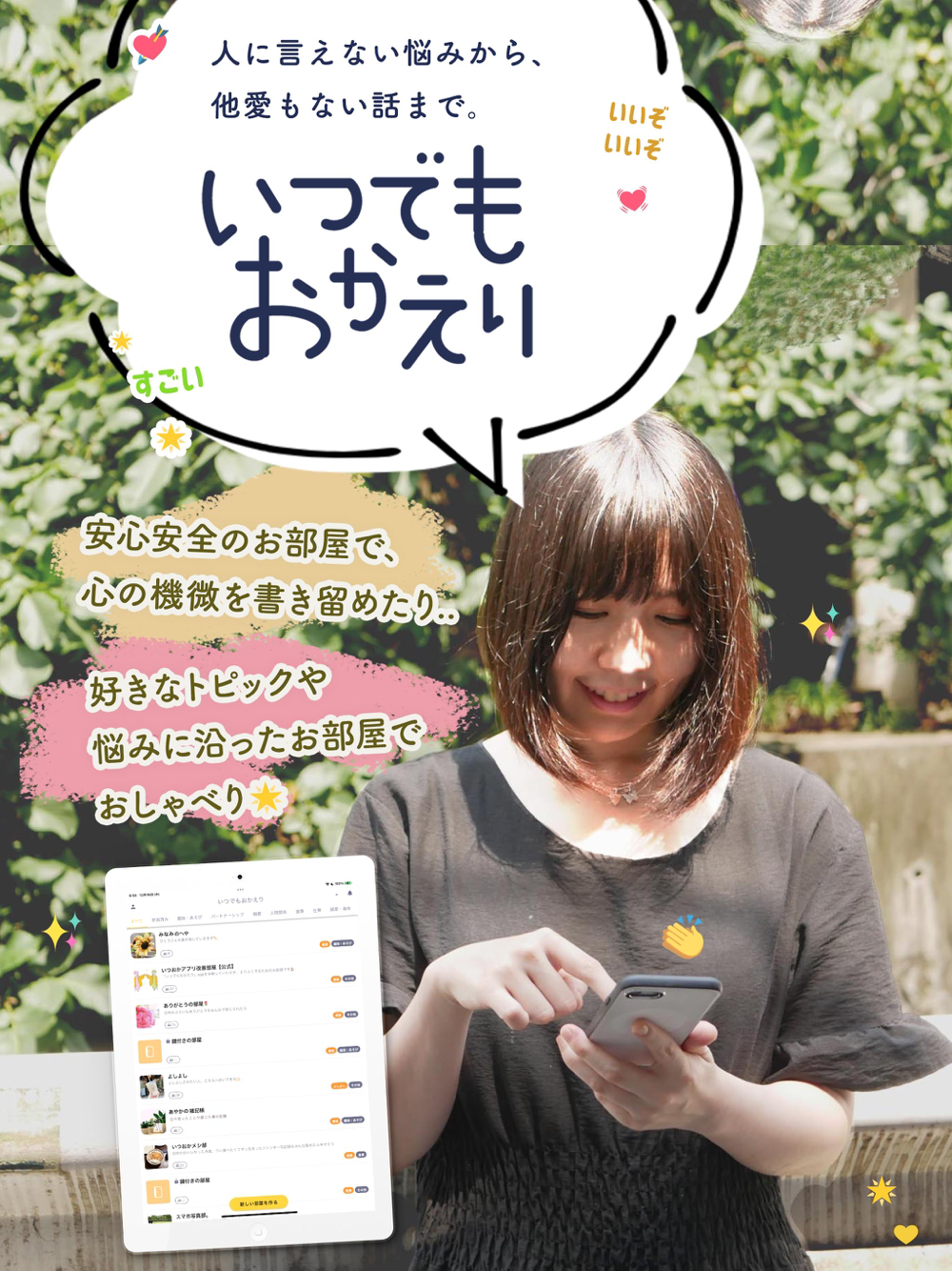 「いつでもおかえり」は”生きづらさ”でつながり共感しあうコミュニティアプリ。匿名空間だから周囲の目を気にする必要もありません。どんなことを呟いても、正義を押し付けられることも批判されることもありません。あるのは吐き出しやすい安心のあなた専用のお部屋と、共感者からのやさしいスタンプの肯定のみ。裂けるような悲しみも、溢れるようなよろこびも、どんな気持ちも掛け替えのあなただけの大切なもの。共に、わたしを、だれかをそっと見守れるあたたかい居場所を育みませんか?