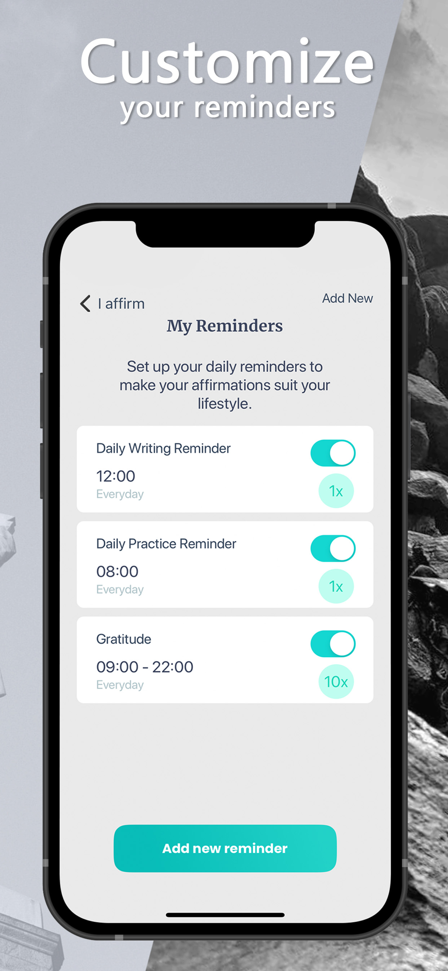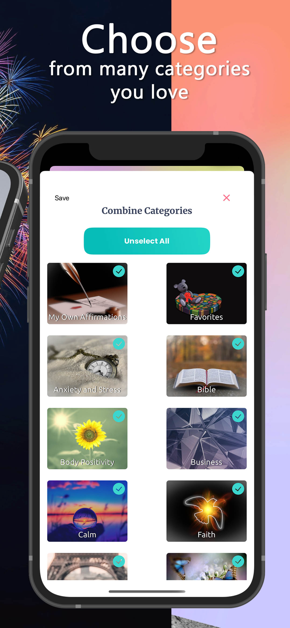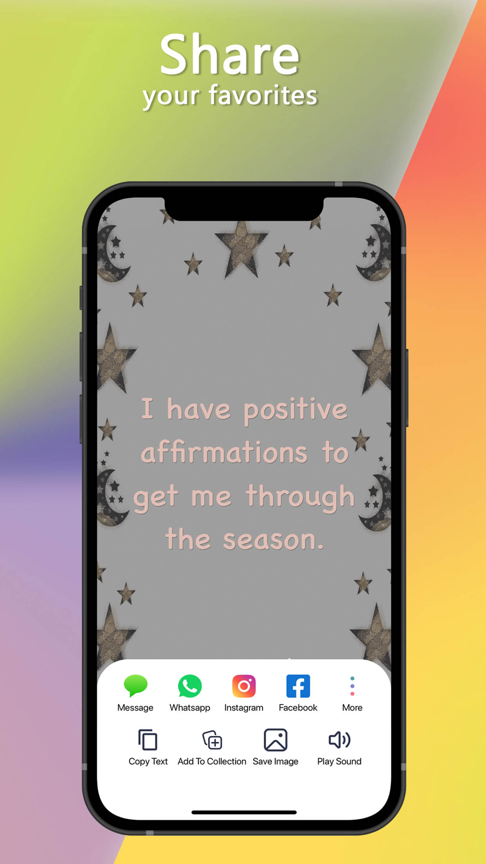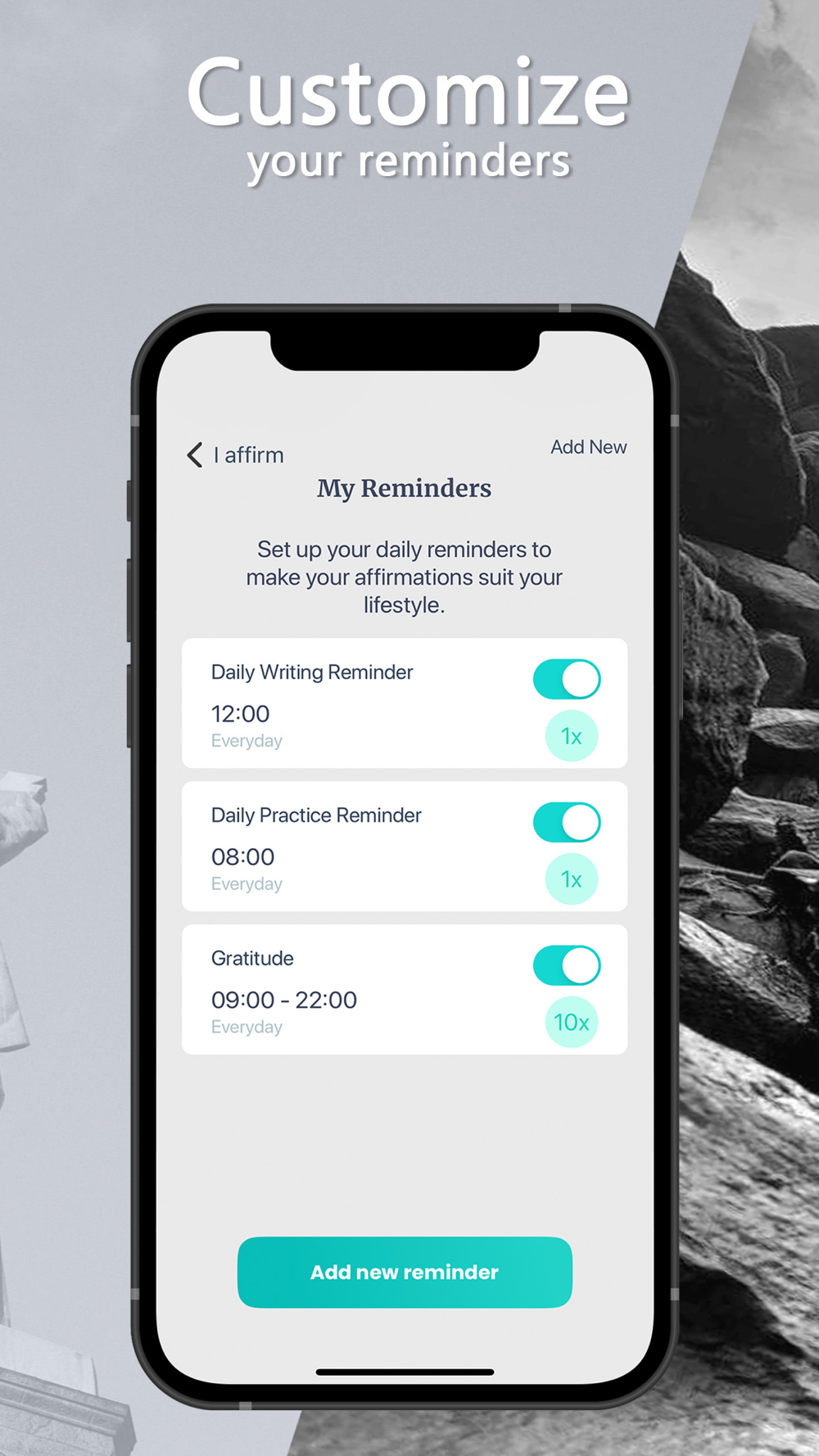 Choose from the app's many categories and tons of affirmations - updated frequently. Set up your daily reminders and you'll receive affirmations throughout the day, to suit your lifestyle. Customize the design of the affirmations, share an affirmation with your friends, or use the image on your social media, or as wallpaper... the choice is yours.