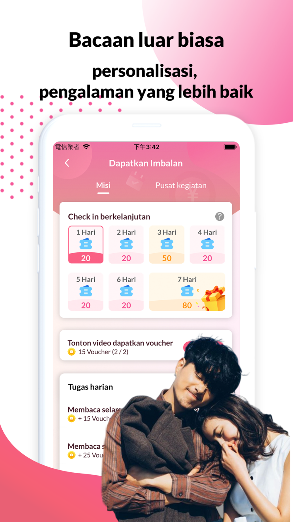 4. Keuntungan : Check in untuk mendapatkan hadiah tugas, Voucher gratis tersedia setiap hari, Lebih banyak aktivitas umpan balik