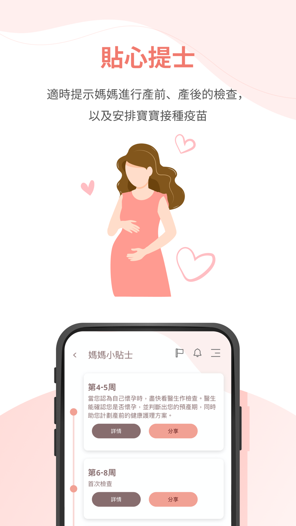 【貼心提示】適時提示媽媽進行產前、產後的檢查,以及安排寶寶接種疫苗。