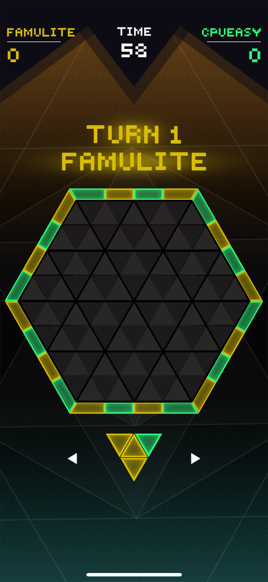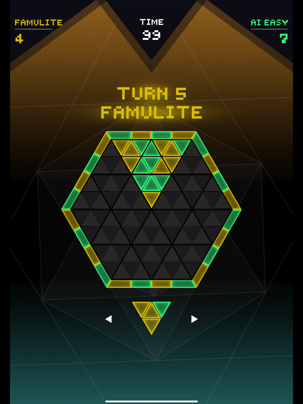 Each player takes turns placing △-pieces, and the player who connects two places of one's color at the edge of the stage first will be a winner.