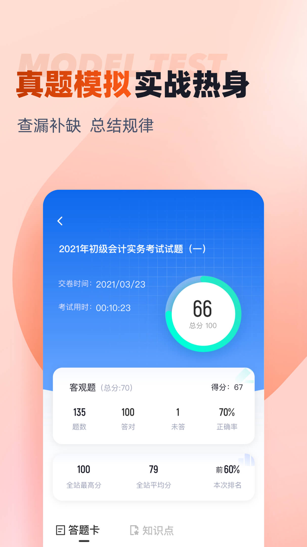 初级会计题库内含考点练习,全国通用卷以及地区卷模拟练习,以及按照固定考试比重的随机式的抽题的真题考场,成绩单实时记录考试数据,一点一滴的反馈考生近期学习状态以及自我正确率的提升,大大的给予考生通过考试的信心。