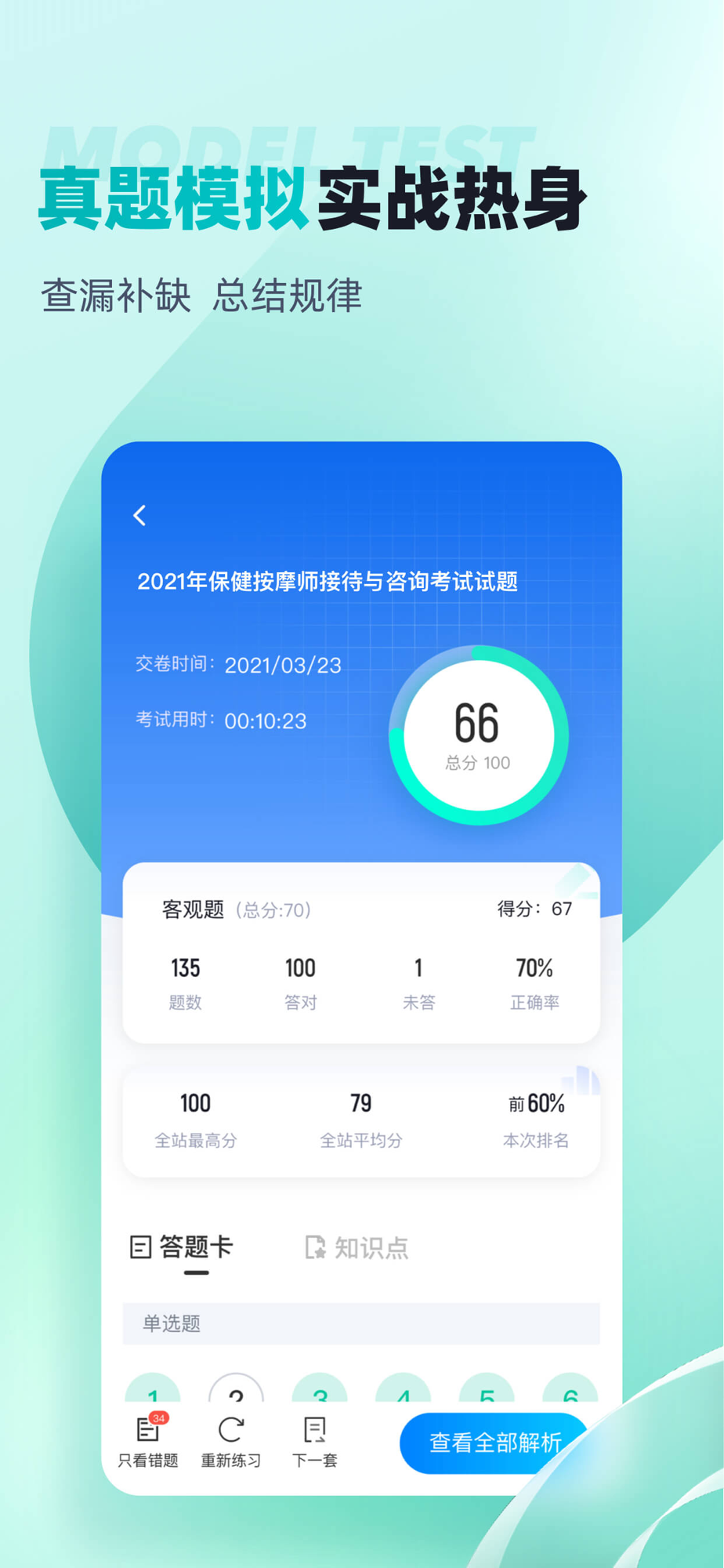 保健按摩师题库内含考点练习,全国通用卷以及地区卷模拟练习,以及按照固定考试比重的随机式的抽题的真题考场,成绩单实时记录考试数据,一点一滴的反馈考生近期学习状态以及自我正确率的提升,大大的给予考生通过考试的信心。
