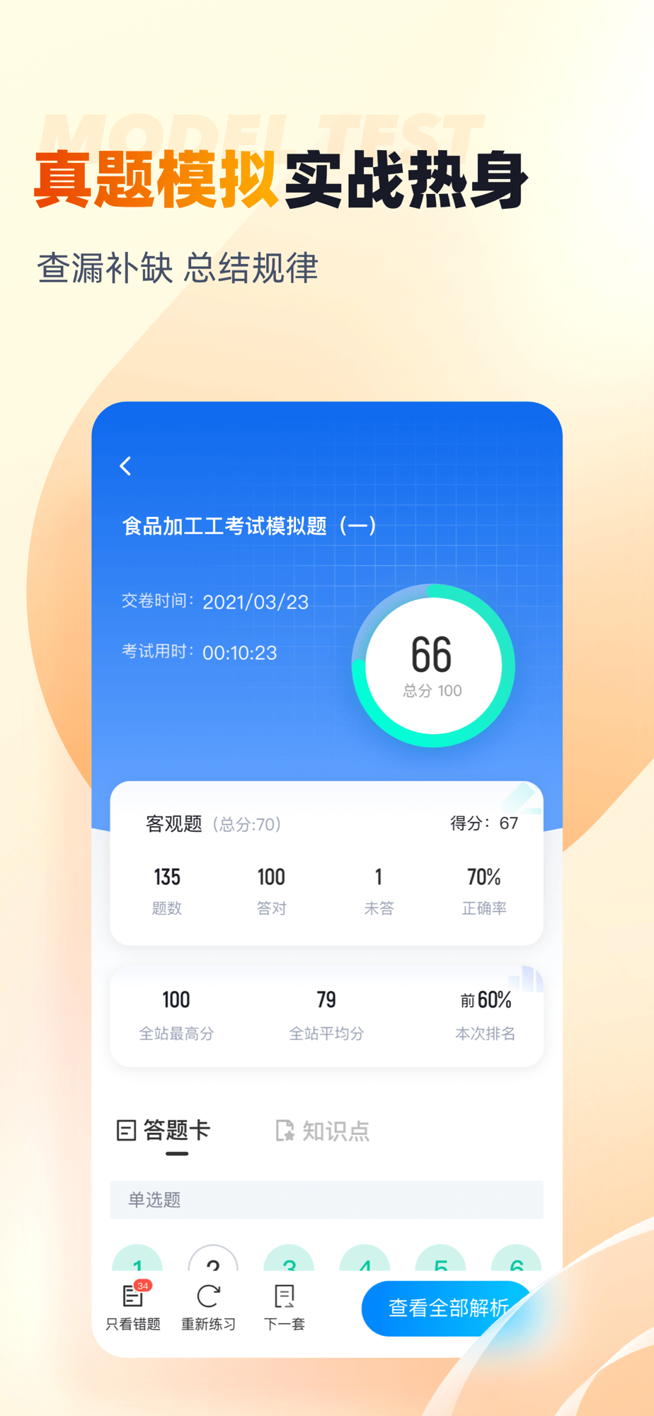 应用内精选汇集历年考试真题及高质量模拟试卷,严格依据最新考试大纲与行业标准精心编写。通过模拟考试功能,您可体验真实考场环境,进行全真限时测试。考试结束后,系统即时生成详细分析报告,清晰展示您在食品加工原理、设备操作、质量控制、安全生产等各模块的掌握情况。智能评估系统精准定位知识薄弱环节,帮助您明确复习重点和改进方向。