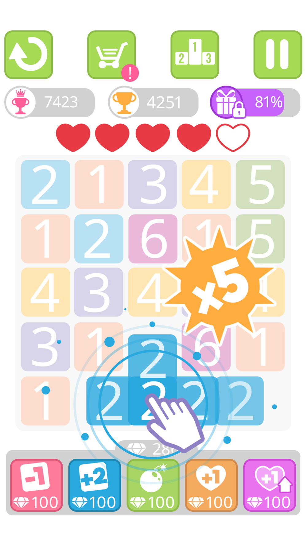 The rules of this game are super simple. You have 5 lives (represented by hearts) and you can click on any box with a number. When you click on a square, you lose a life but you add +1 to the number in that square. If at least 3 boxes with an identical number are next to each other, then they join together to form a higher number. This new higher number can also now form a new group of 3 or more and so on ... That's it, you understand, but will you be able to generate chain reactions?