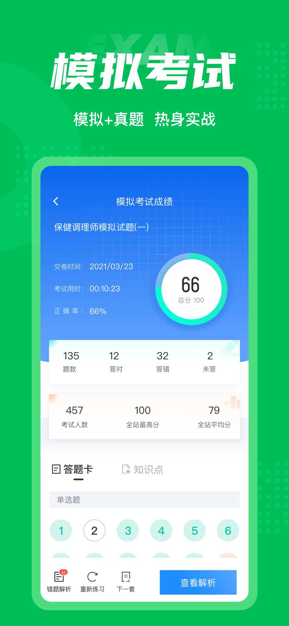 保健调理师题库内含考点练习,全国通用卷以及地区卷模拟练习,以及按照固定考试比重的随机式的抽题的真题考场,成绩单实时记录考试数据,一点一滴的反馈考生近期学习状态以及自我正确率的提升,大大的给予考生通过考试的信心。