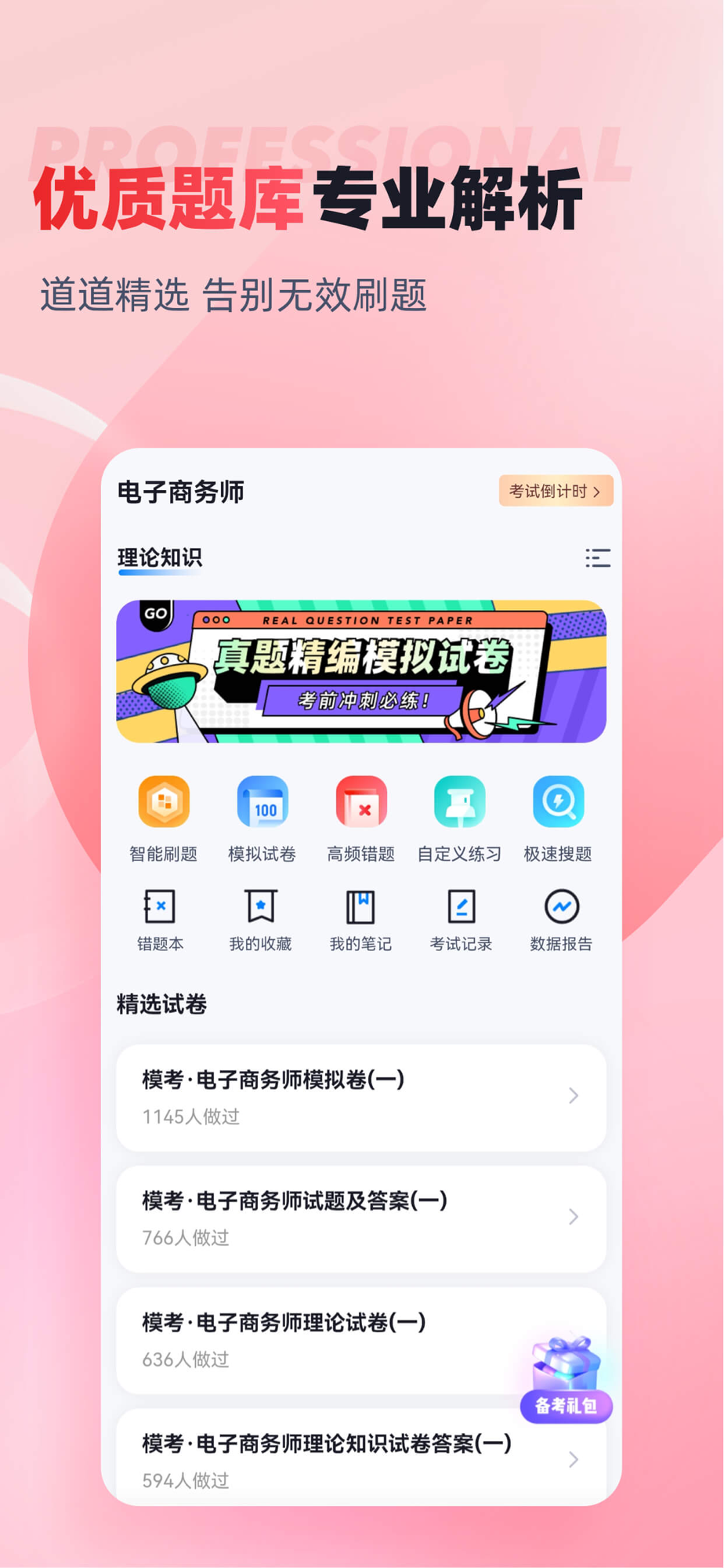 《电子商务师考试聚题库》集模拟考试、知识点精练与错题管理于一体,设计科学,操作便捷。是您系统复习、查漏补缺、提升应试能力的理想选择。下载应用,开启高效备考之旅,助力您顺利通过电子商务师考试。