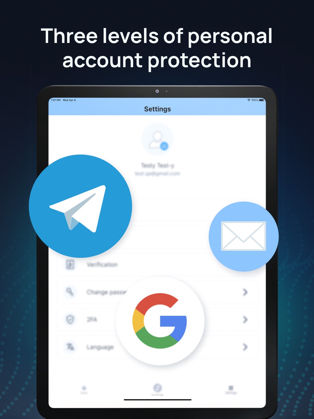 - Three levels of two-factor user authentication: email, Google Authenticator, Telegram.